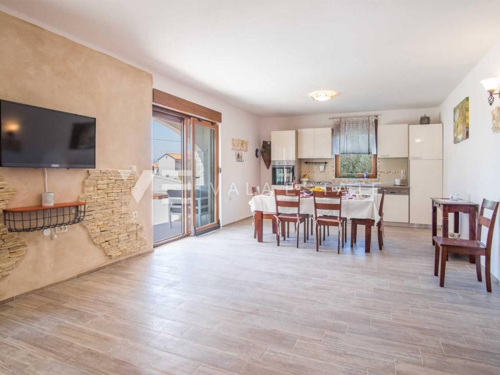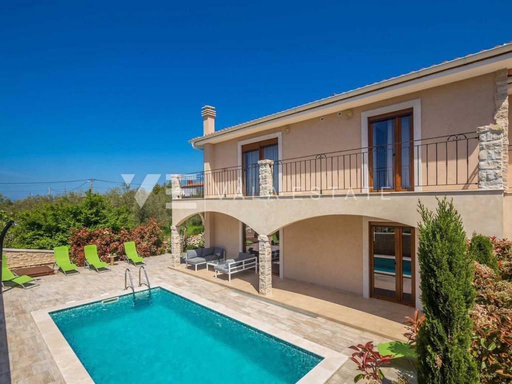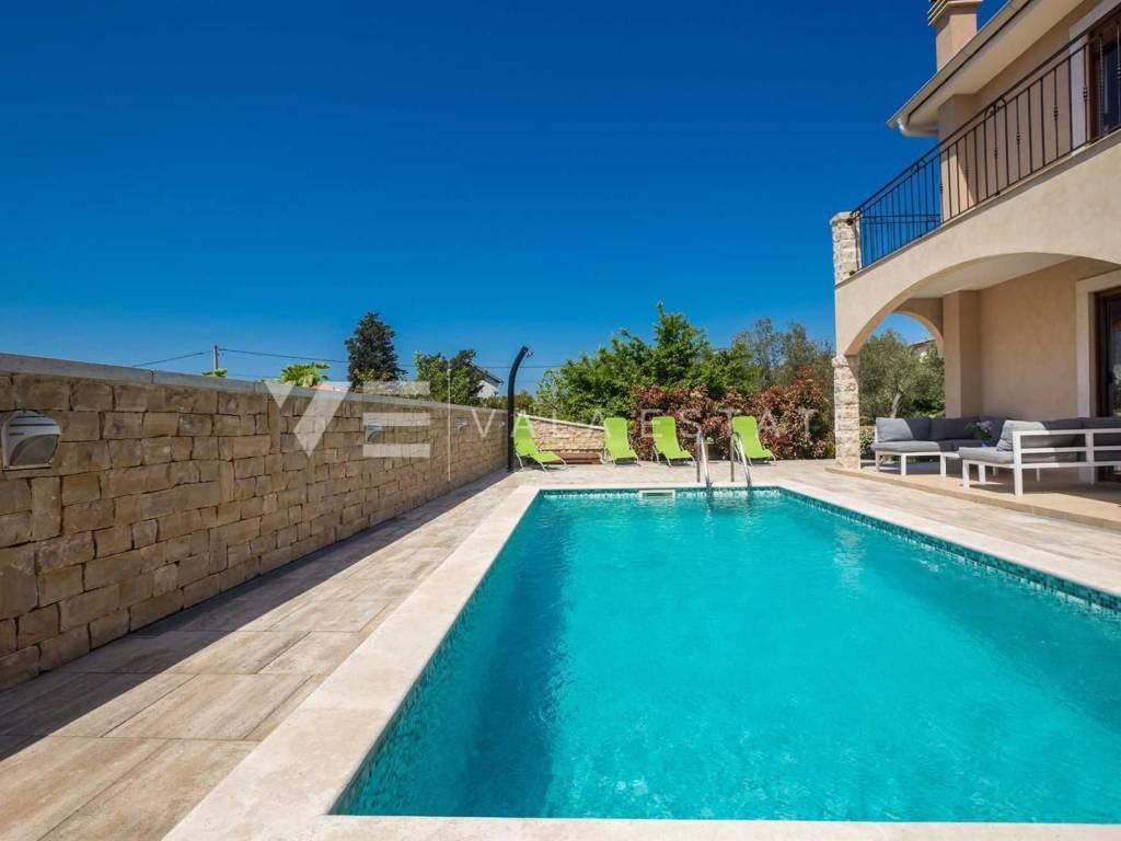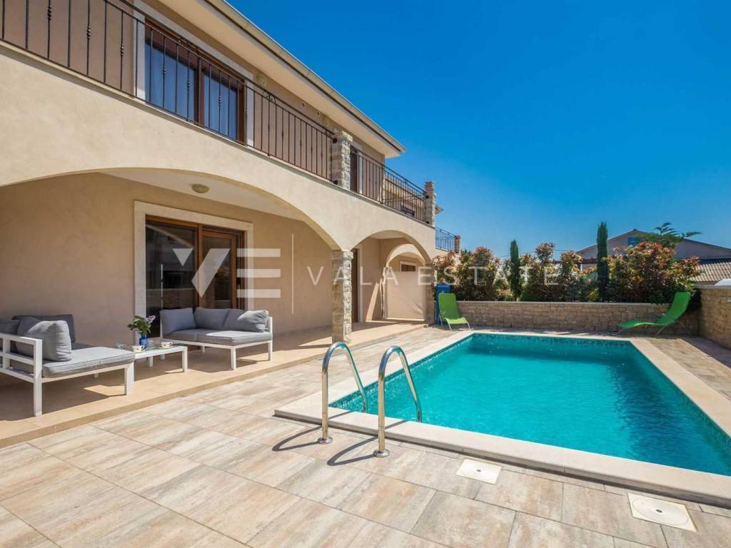 Real estate island of Krk, town of Krk surroundings - for sale is a semi-detached house with 200 m2 of living space, which is arranged on the ground floor and first floor. The ground floor consists of an entrance hall, bedroom, bathroom, kitchen with dining area and living room with access to a covered terrace and garden, while the first floor includes a hallway and three bedrooms, each with its own bathroom, two of which have access to a covered terrace with a beautiful sea view. The house is built of very high-quality materials, the floor is covered with ceramics and parquet, it is air-conditioned, has PVC joinery and is fully furnished and equipped. On the landscaped garden there is a swimming pool with a sunbathing area, a summer kitchen and two parking spaces. A beautiful, quiet location with an open view of the sea for all lovers of a peaceful holiday, but also a good opportunity for investment for tourist rental purposes. The distance from the sea and beaches and all amenities is about 1800 meters.