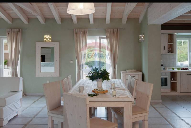 Vanjski prostori su: ljetna kuhinja s roštiljem, blagovaonica uz bazen (36 m2) i natkriveno parkiralište.