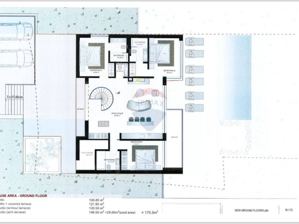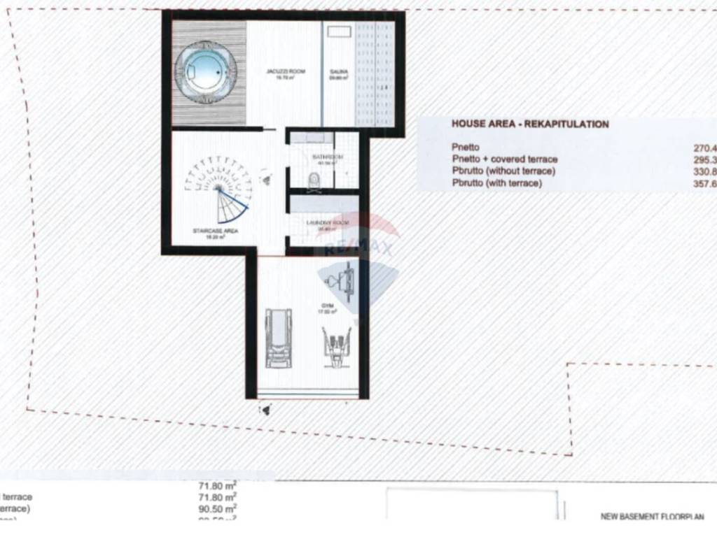 Ukupna brutto površina vile sa terasama i bazenom iznosi 390,00 m2 a uključuje 4 spavaće sobe svaka sa svojom kupaonom, 2 dnevna boravka, blagovaona, kuhinja, sauna , jacuzzi , fitnes sa dodatnom kupaonom i laundry prostorom.