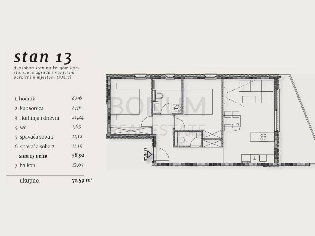 S13- consists of hallway, kitchen, living room and dining room in one unit, two bedrooms, bathroom, toilet (58.92 m2), balcony (12.67 m2) and outdoor parking space.