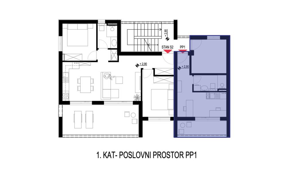 Površina zatvorenog stambenog prostora iznosi 26,6 m2, dok je loggi-a površine 6 m2. Ukupna neto korisna površina stana iznosi 33, 33 m2.