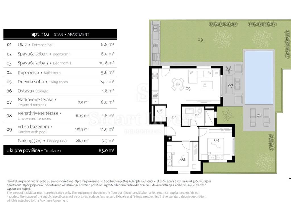 The apartment consists of an entrance hall, two bedrooms, a bathroom, a storage room, and an open-space living room with kitchen and dining room. The living area opens onto a covered terrace and a private garden with a swimming pool the perfect place to enjoy early morning hours, an afternoon rest or evening socializing.
