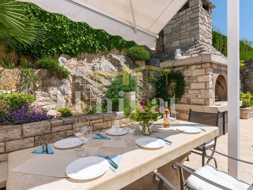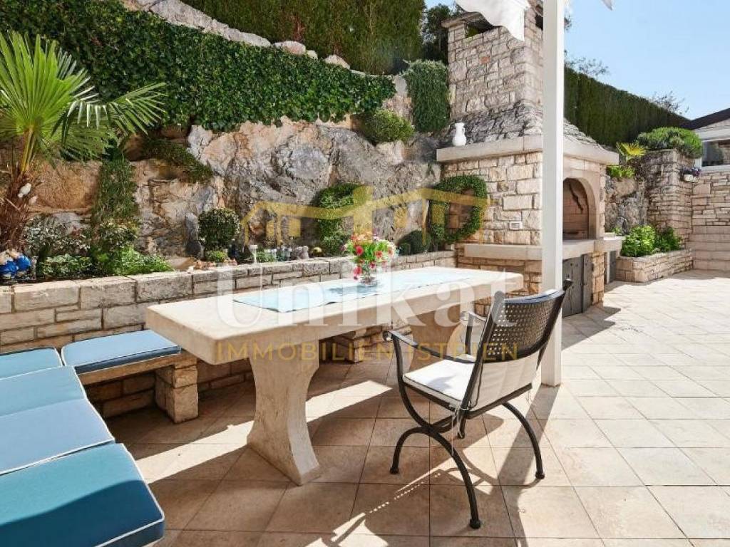 These three buildings (main house, two ground-floor apartments) are built in a U-shape, and between them is a swimming pool with a spacious sunbathing area. The pool is 45 m2 large, heated, with salt water, and has a special function for creating waves. There is also a summer kitchen with a built-in barbecue on the sunbathing area.