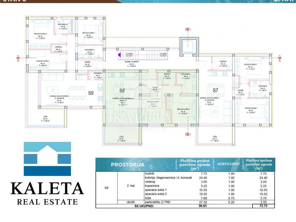 Apartment S8, with a total sales area of 72.75 m² net, is located on the 2nd floor and has 61.05 m² of interior space. It also includes a loggia of 7.6 m² and two parking spaces, giving a total of 96.65 m² of actual usable area.