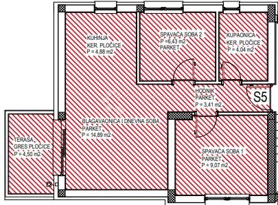 Location and project Apartment S5 is located on the first floor of a modern residential building in Stupnik. A quiet microlocation, quality new construction and a well-designed floor plan make this apartment an excellent choice for living or investment. The price includes the associated PM5 parking space. Floor plan and layout The apartment has a total of 47.47 m2 of internal usable area. The layout includes an entrance hall, two bedrooms, a bathroom, a kitchen and an open-concept dining and living room. The apartment also has a 4.50 m2 terrace that provides a pleasant outdoor space for morning coffee or evening relaxation. Property advantages The apartment is functional, bright and easy to furnish thanks to the regular room floor plans. The project was carried out to a high standard, and the smaller number of apartments in the building ensures a quiet and pleasant environment. A PM5 parking space of 12.50 m2 is included in the ownership and is an ideal solution for stress-free parking.