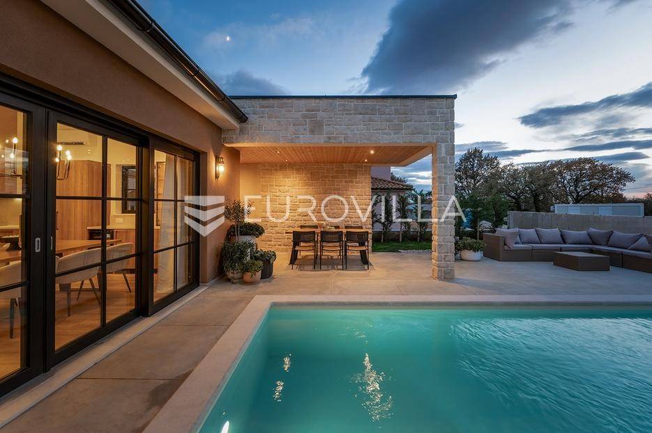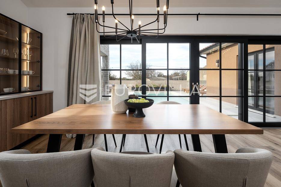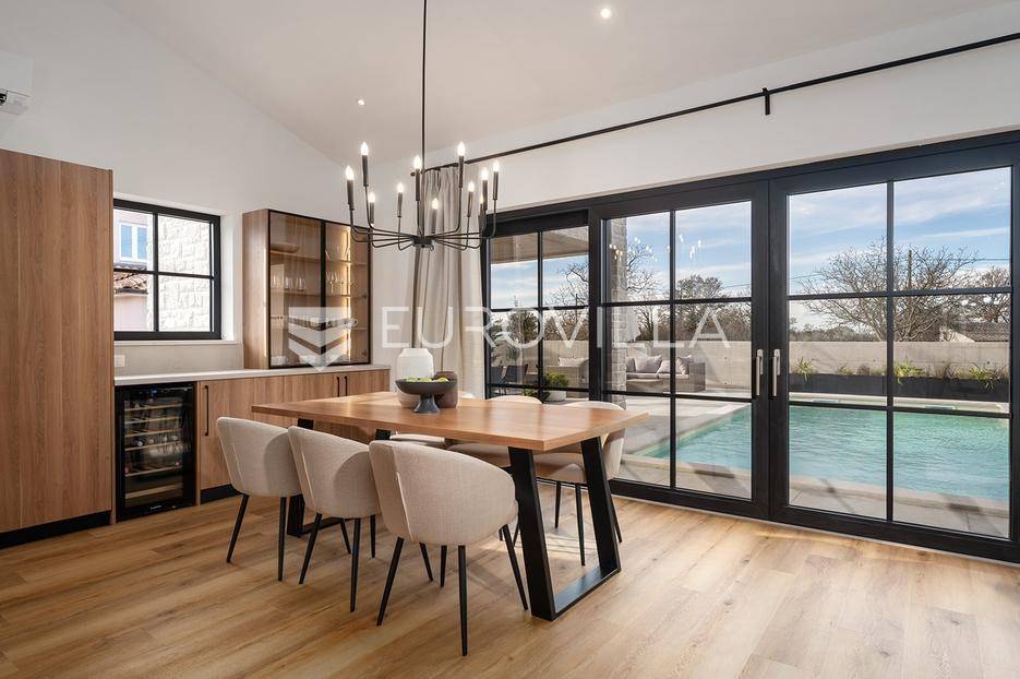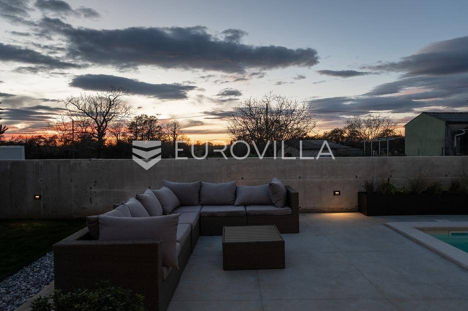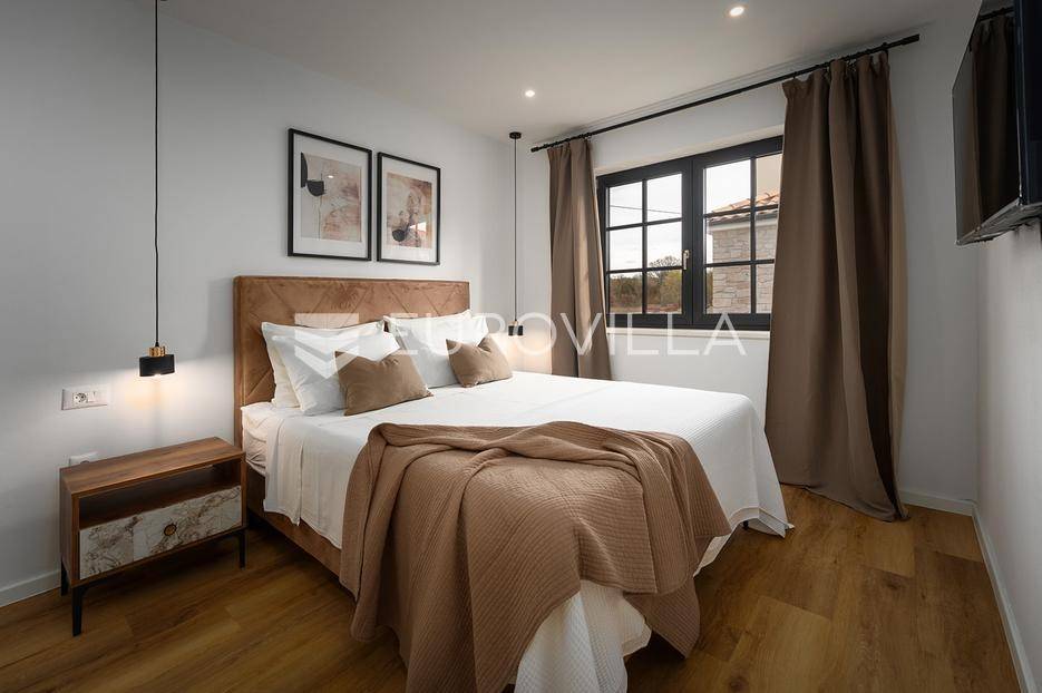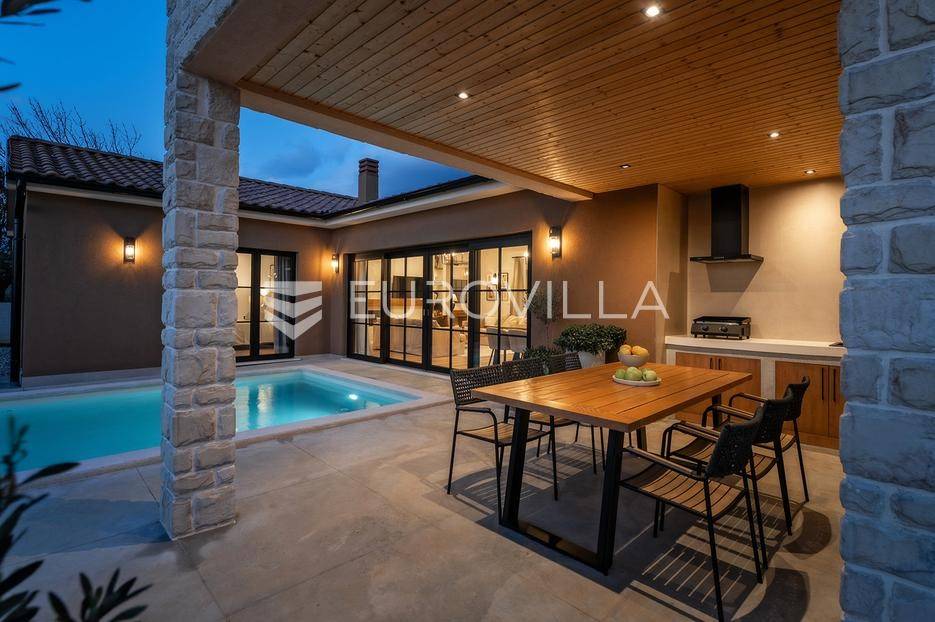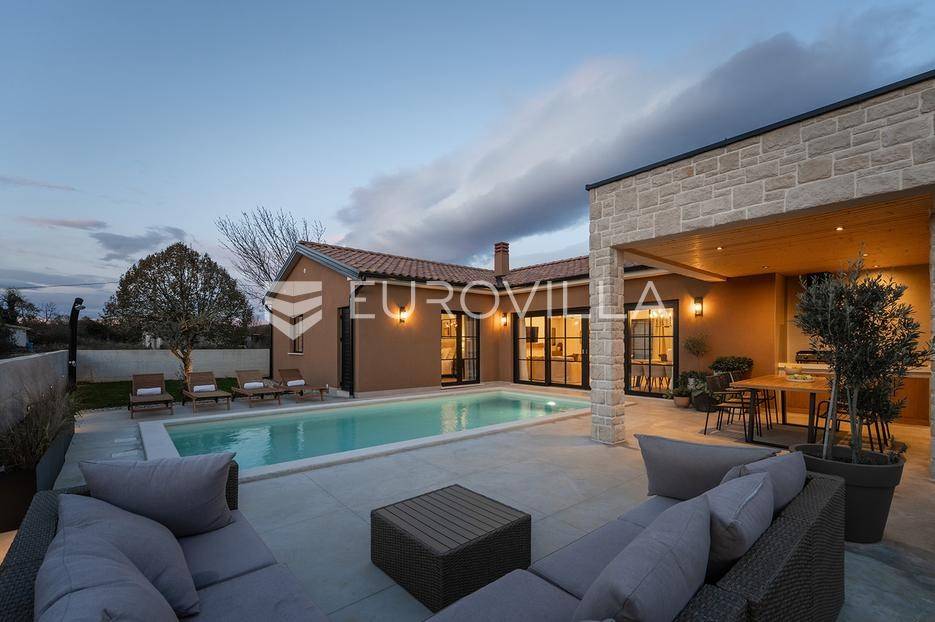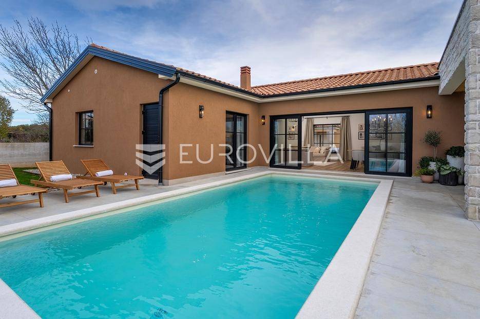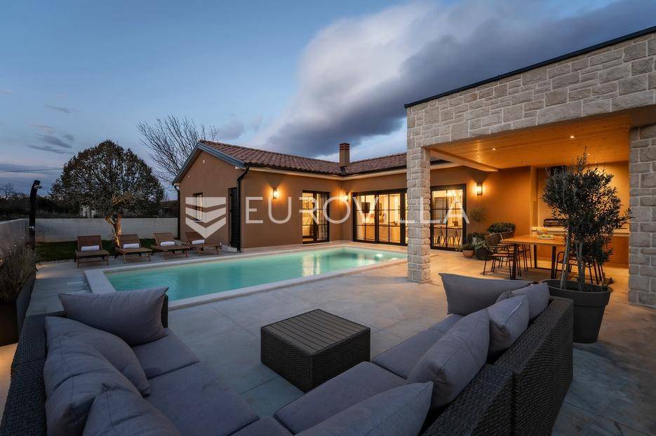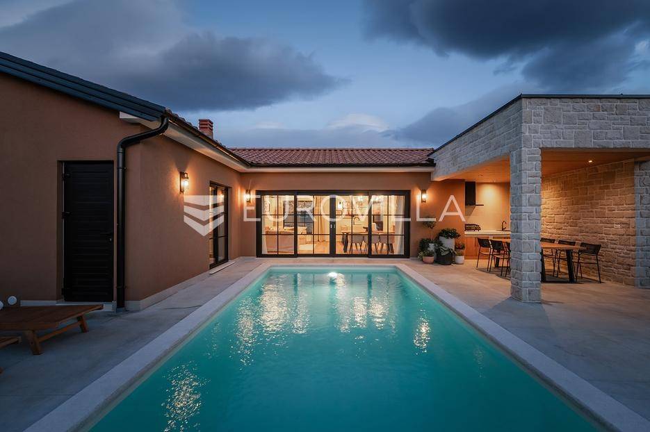Smještena na izoliranoj lokaciji nedaleko samog Žminja, okružena s tek nekoliko novih kuća, prodaje se ova prekrasna, moderna i dizajnerski namještena samostojeća prizemnica. Površine 139.33 m2, prostire se na 523 m2 zemljišta.Sastoji se od ulaznog hodnika, dvije spavaće sobe, svaka sa svojom kupaonicom ( master soba ima vlastiti walk-in ormar te izlaz na bazen ), gostinjski wc, vešeraj, prostrani open space koncept dnevnog boravka, kuhinje i blagovaonice iz koje se pristupa vanjskom prostoru gdje se smjestio bazen od 26 m2 te natkrivena ljetna kuhinja. S vanjske strane se smjestila i strojarnica.Kuća je pomno dizajnirana, gdje je praktički sav namještaj napravljen po mjeri stolara. Podno električno grijanje je provedeno kroz cijelu kuću. Dodatna tri klima uređaja su smještena u svakoj sobi, a za dodatni ugođaj pobrinula se peć na drva u dnevnom boravku. Izolacija je 10 cm stiropor, a krov je betonski s pojačanom izolacijom. Podovi su u vinilu te u keramici u kupaonicama.Orjentacija kuće je sjever, istok, jug i zapad. Godina izgradnje je 2025, te se prodaje u namještenom stanju.Ukoliko tražite spoj modernog i rustikalnog toplog ugođaja na lokaciji koja Vam zasigurno osigurava mir onda je ova nekretnina pravi odabir za Vas. Slobodno nam se obratite, stojimo Vam na raspolaganju za više informacija.