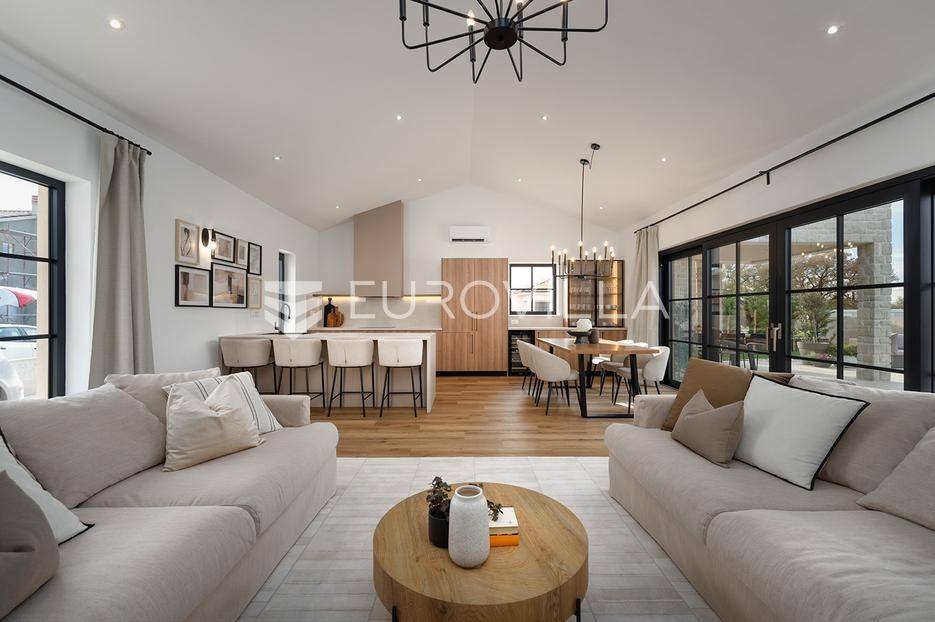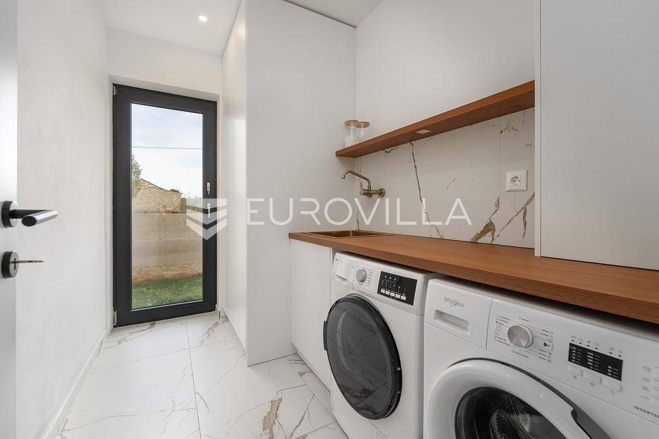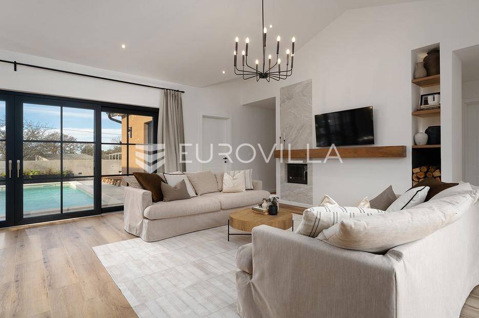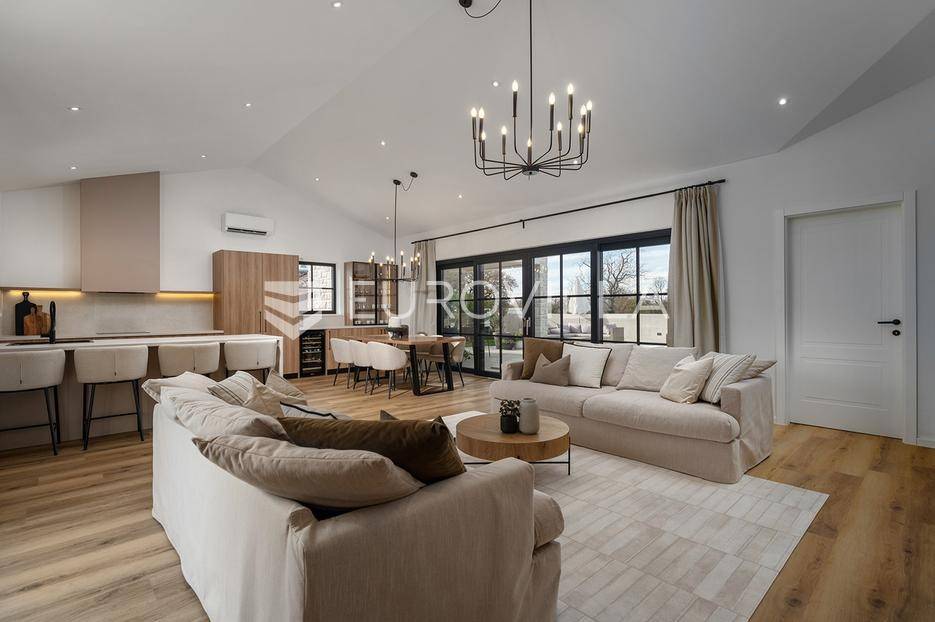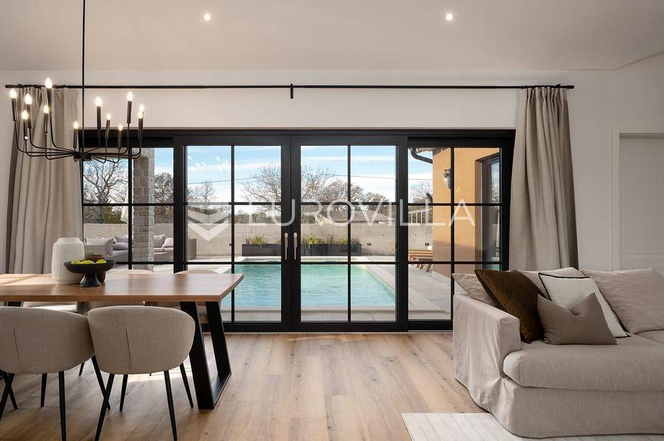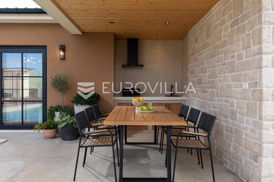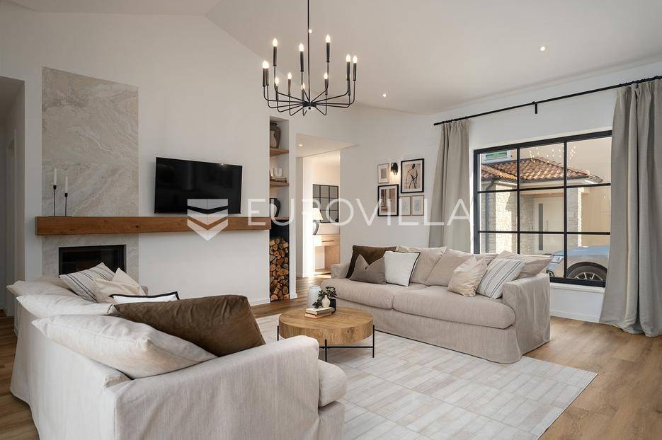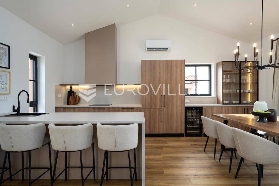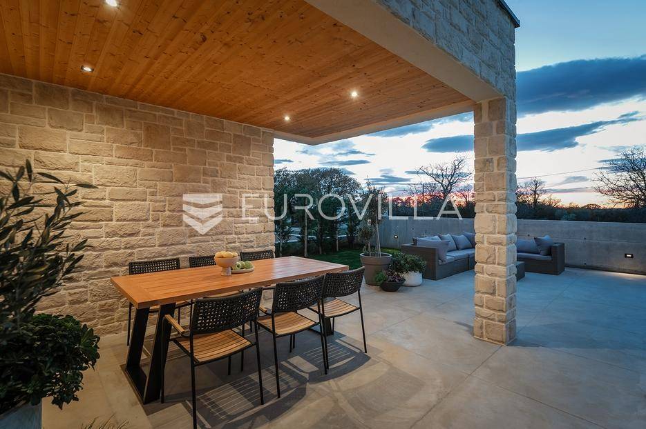 Smještena na izoliranoj lokaciji nedaleko samog Žminja, okružena s tek nekoliko novih kuća, prodaje se ova prekrasna, moderna i dizajnerski namještena samostojeća prizemnica. Površine 139.33 m2, prostire se na 523 m2 zemljišta.Sastoji se od ulaznog hodnika, dvije spavaće sobe, svaka sa svojom kupaonicom ( master soba ima vlastiti walk-in ormar te izlaz na bazen ), gostinjski wc, vešeraj, prostrani open space koncept dnevnog boravka, kuhinje i blagovaonice iz koje se pristupa vanjskom prostoru gdje se smjestio bazen od 26 m2 te natkrivena ljetna kuhinja. S vanjske strane se smjestila i strojarnica.Kuća je pomno dizajnirana, gdje je praktički sav namještaj napravljen po mjeri stolara. Podno električno grijanje je provedeno kroz cijelu kuću. Dodatna tri klima uređaja su smještena u svakoj sobi, a za dodatni ugođaj pobrinula se peć na drva u dnevnom boravku. Izolacija je 10 cm stiropor, a krov je betonski s pojačanom izolacijom. Podovi su u vinilu te u keramici u kupaonicama.Orjentacija kuće je sjever, istok, jug i zapad. Godina izgradnje je 2025, te se prodaje u namještenom stanju.Ukoliko tražite spoj modernog i rustikalnog toplog ugođaja na lokaciji koja Vam zasigurno osigurava mir onda je ova nekretnina pravi odabir za Vas. Slobodno nam se obratite, stojimo Vam na raspolaganju za više informacija.