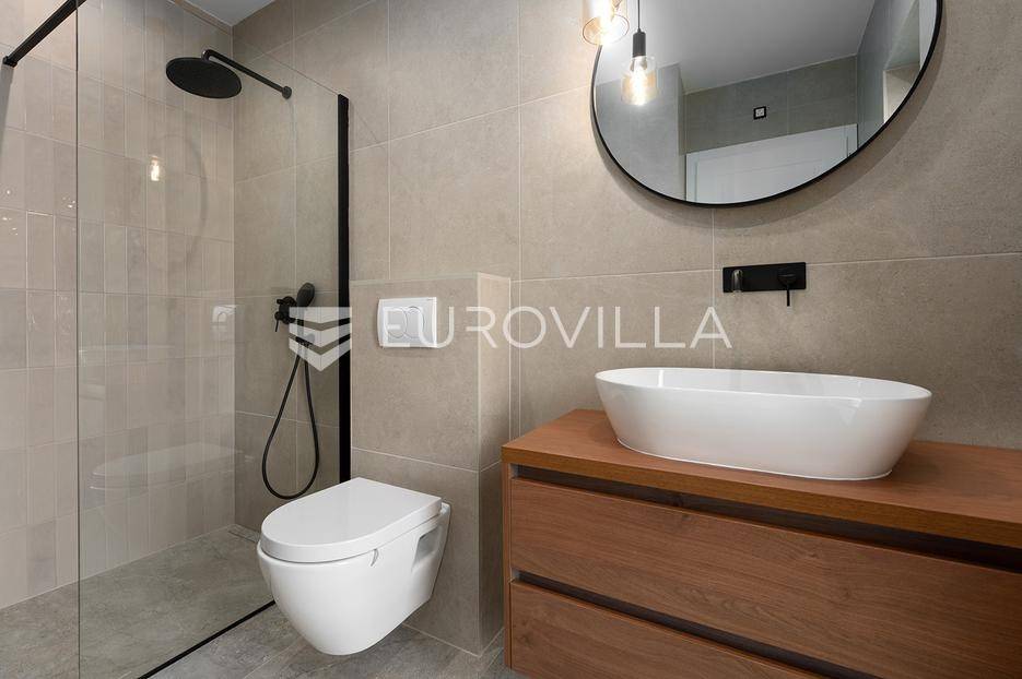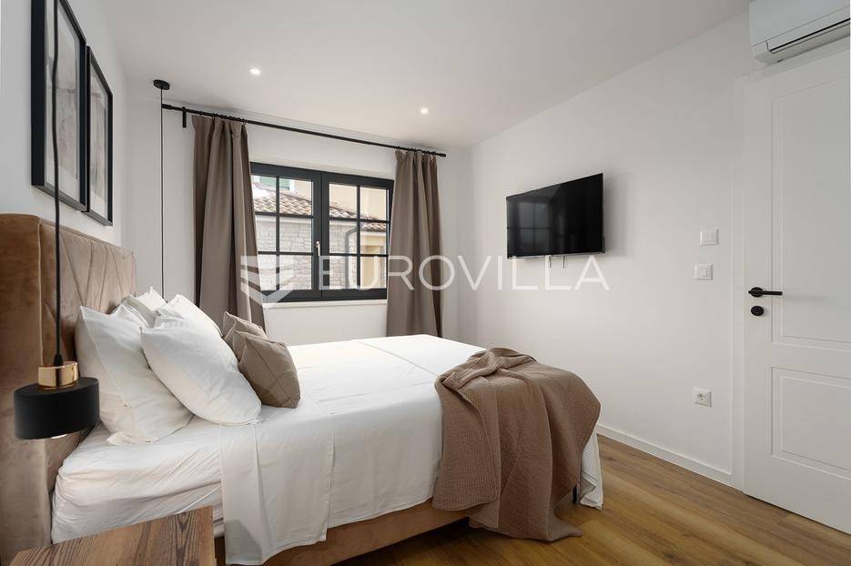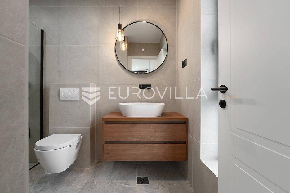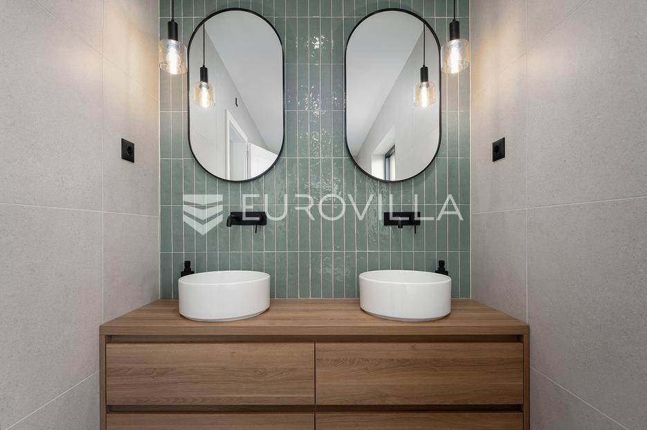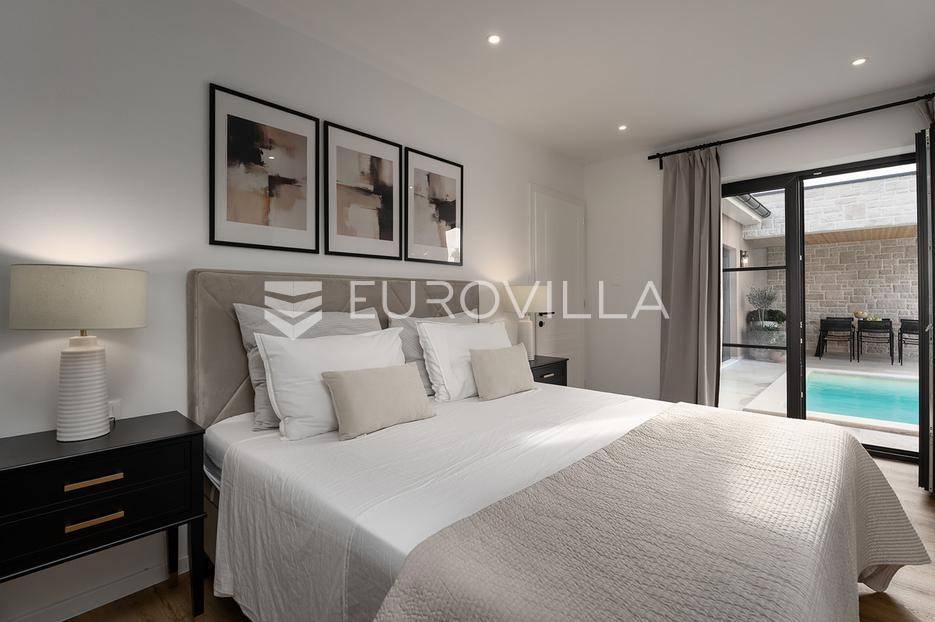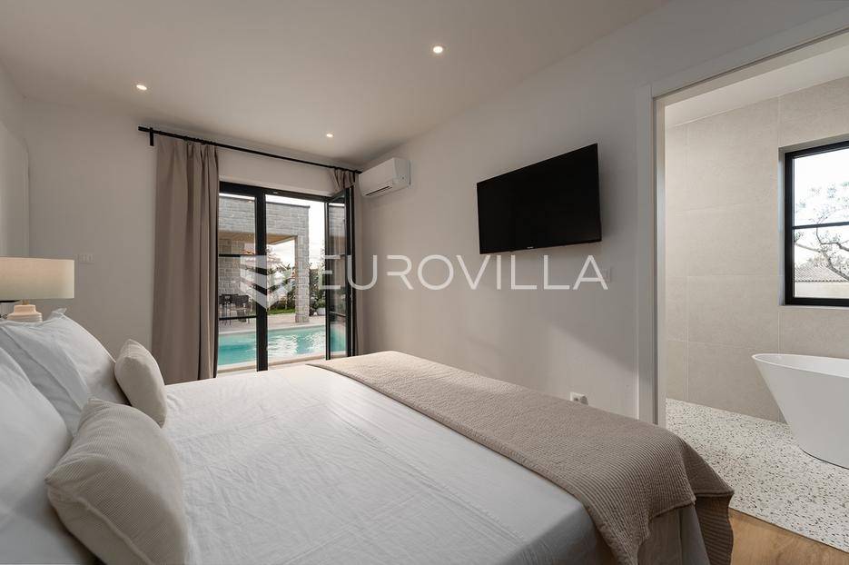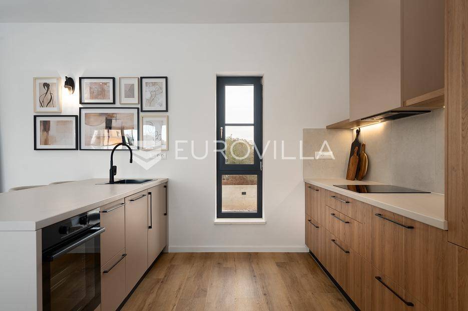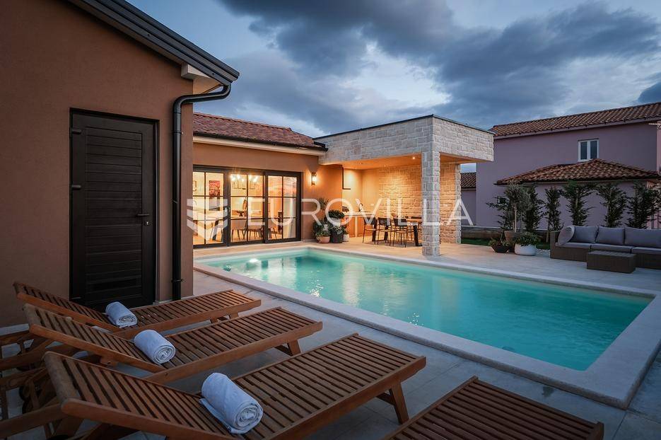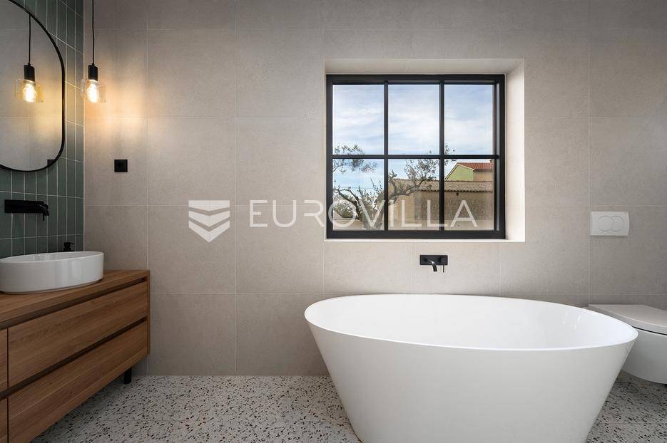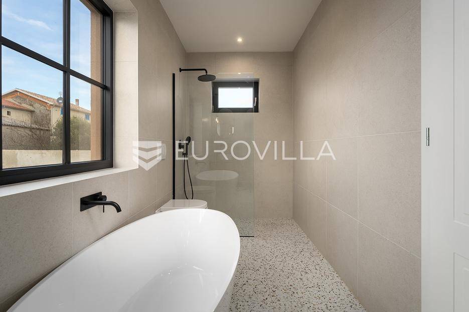 Smještena na izoliranoj lokaciji nedaleko samog Žminja, okružena s tek nekoliko novih kuća, prodaje se ova prekrasna, moderna i dizajnerski namještena samostojeća prizemnica. Površine 139.33 m2, prostire se na 523 m2 zemljišta.Sastoji se od ulaznog hodnika, dvije spavaće sobe, svaka sa svojom kupaonicom ( master soba ima vlastiti walk-in ormar te izlaz na bazen ), gostinjski wc, vešeraj, prostrani open space koncept dnevnog boravka, kuhinje i blagovaonice iz koje se pristupa vanjskom prostoru gdje se smjestio bazen od 26 m2 te natkrivena ljetna kuhinja. S vanjske strane se smjestila i strojarnica.Kuća je pomno dizajnirana, gdje je praktički sav namještaj napravljen po mjeri stolara. Podno električno grijanje je provedeno kroz cijelu kuću. Dodatna tri klima uređaja su smještena u svakoj sobi, a za dodatni ugođaj pobrinula se peć na drva u dnevnom boravku. Izolacija je 10 cm stiropor, a krov je betonski s pojačanom izolacijom. Podovi su u vinilu te u keramici u kupaonicama.Orjentacija kuće je sjever, istok, jug i zapad. Godina izgradnje je 2025, te se prodaje u namještenom stanju.Ukoliko tražite spoj modernog i rustikalnog toplog ugođaja na lokaciji koja Vam zasigurno osigurava mir onda je ova nekretnina pravi odabir za Vas. Slobodno nam se obratite, stojimo Vam na raspolaganju za više informacija.