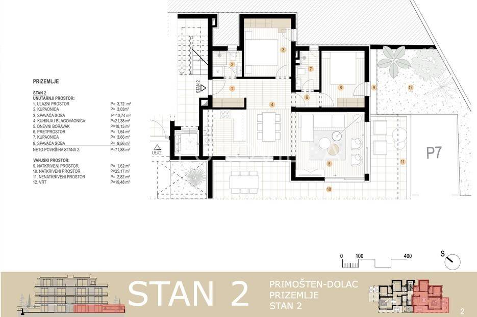 Moderan stan u prizemlju s vrtom, smješten u drugom redu do mora, ukupne neto korisne površine 90,97 m². Stanu pripada jedno parkirno mjesto, a zatvoreni stambeni prostor iznosi 71,88 m².Stan se sastoji od dnevnog boravka s kuhinjom i blagovaonicom, dvije spavaće sobe - od kojih jedna ima privatnu kupaonicu - te dodatne kupaonice. Iz dnevnog boravka izlazi se na prostranu terasu od 30 m² s prekrasnim pogledom na more. Stanu pripada i vrt od 19,5 m², idealan za opuštanje, jacuzzi, lounge zonu ili privatni mediteranski kutak.