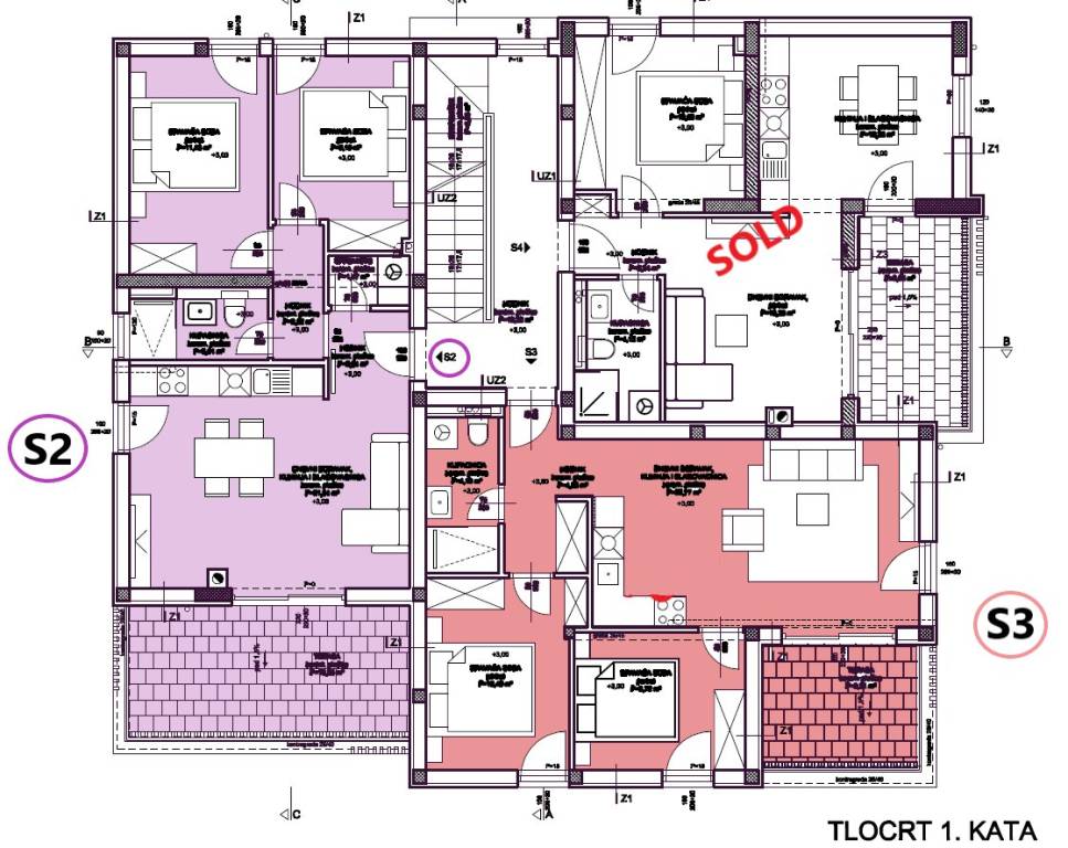 Apartment S1 with a total usable area of ​​67.89 m2 (living area 48.80 m2 + terrace 13.34 m2 + garden 13 m2 + parking 15 m2) is located on the ground floor. It consists of a hallway, two bedrooms, bathroom, living room with kitchen and dining room, and a terrace with access to the yard of 13 m2. The apartment has one parking space. The price is €245,000 (VAT included - the buyer is exempt from paying 3% real estate tax).
