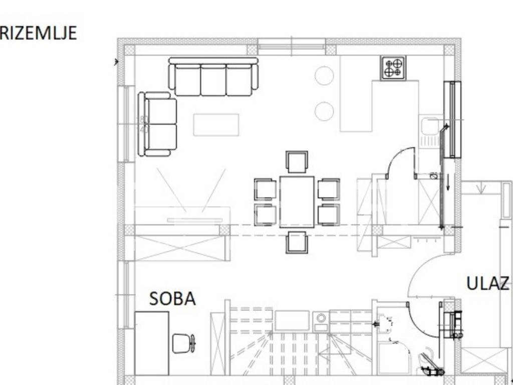 PRIZEMLJE: "open space" dnevni boravak s blagovaonicom, kuhinjom i ostavom, soba i kupaonica s wc-om.