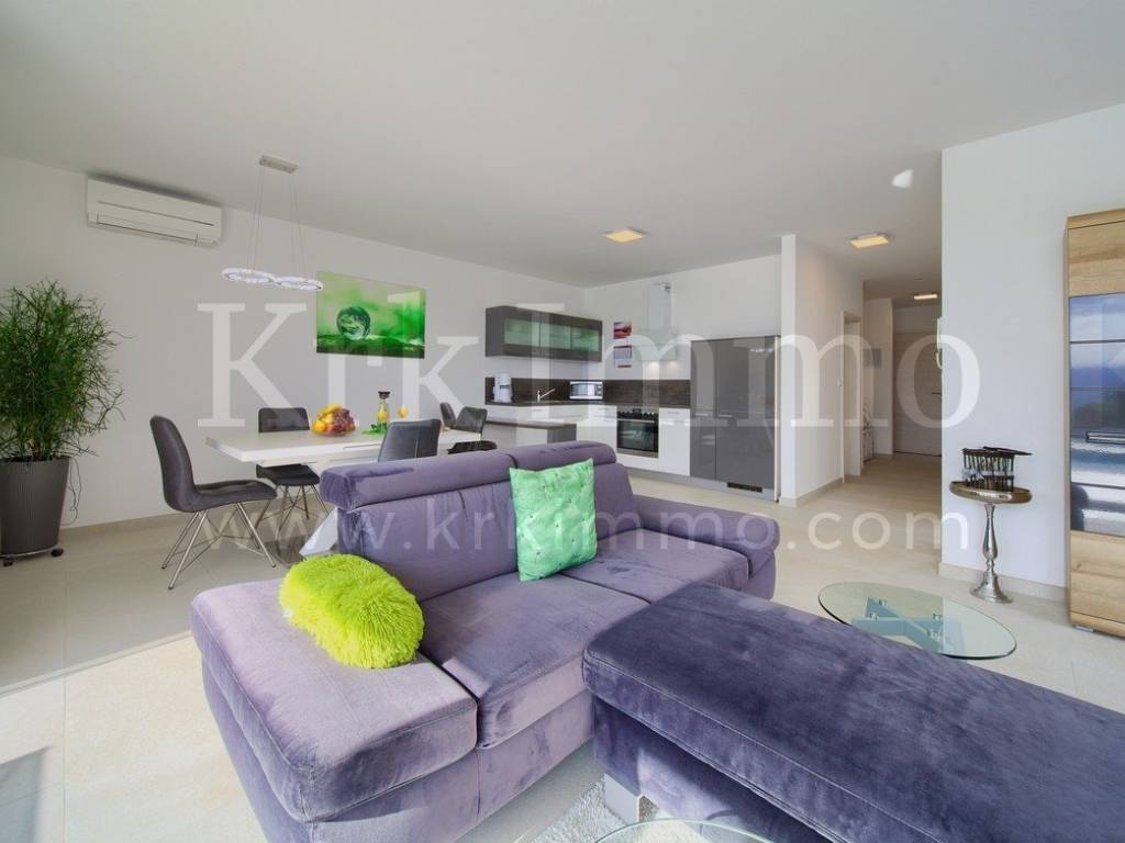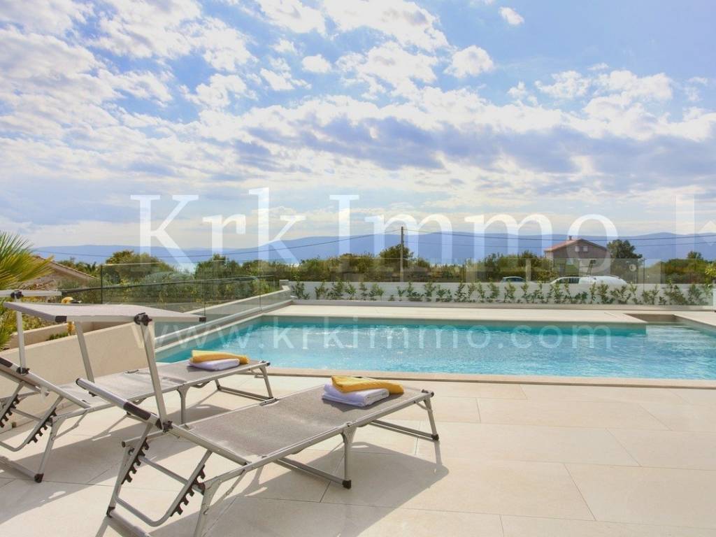 For sale is a modern villa with four furnished, equipped apartments and a swimming pool in a beautiful, quiet location near the town of Krk. The total living area of ​​the villa is 470 m2 and it has 3 floors: basement, ground floor and first floor. In the basement there is an office and a laundry room, two apartments are located on the ground floor and two are upstairs. Each apartment has two bedrooms, two bathrooms, modern kitchen, dining room and living room with access to a large terrace with beautiful sea view. The apartments are fully equipped and furnished.