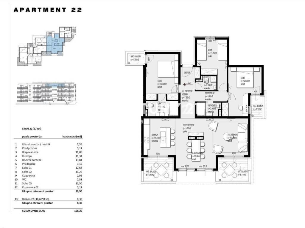 Stan 22 nalazi se na trećem katu zgrade, interijer je površine 99.90m2, a ima i četiri balkona ukupne površine 16.60m2.