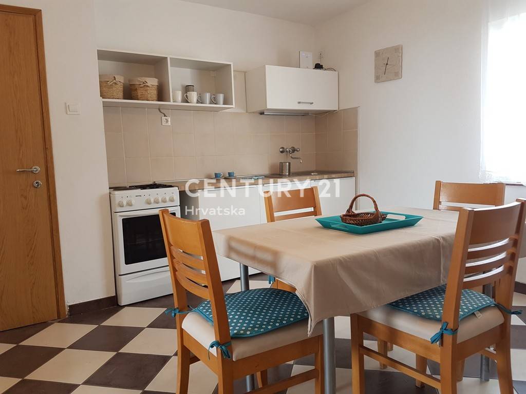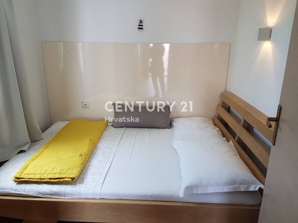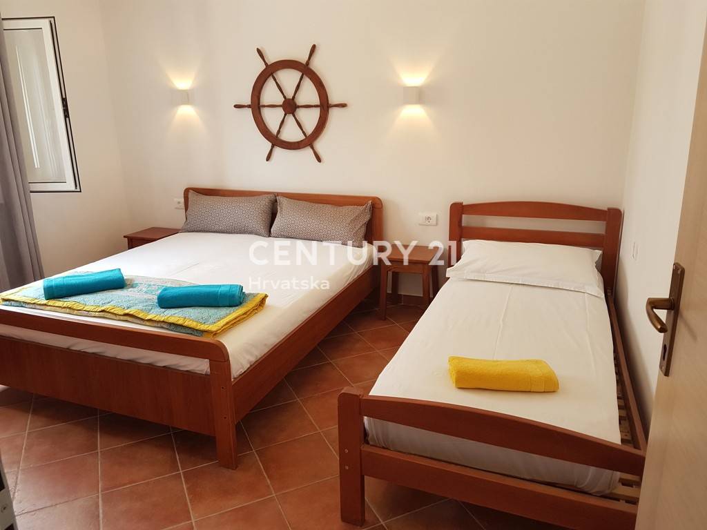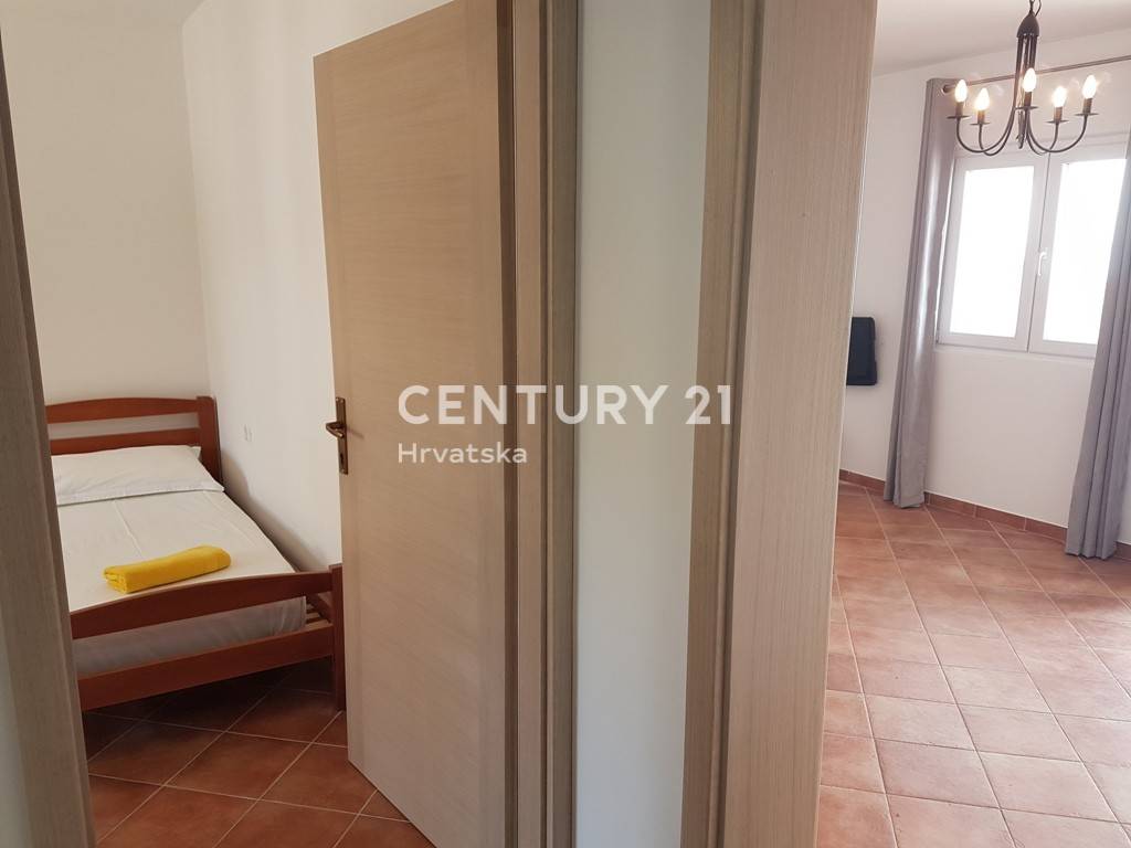 Na prvom katu kuće se nalazi apartman od 57m2 neto površine: kuhinja, dnevni boravak, predsoblje, dvije spavaće sobe, kupaonica i velika terasa.