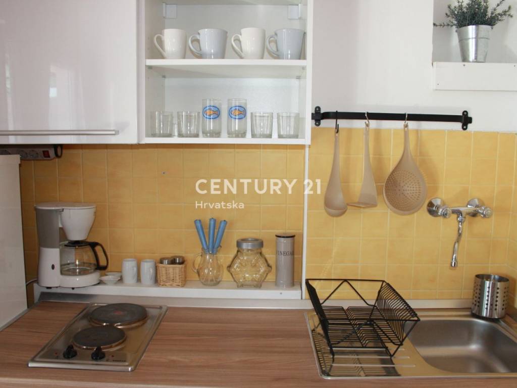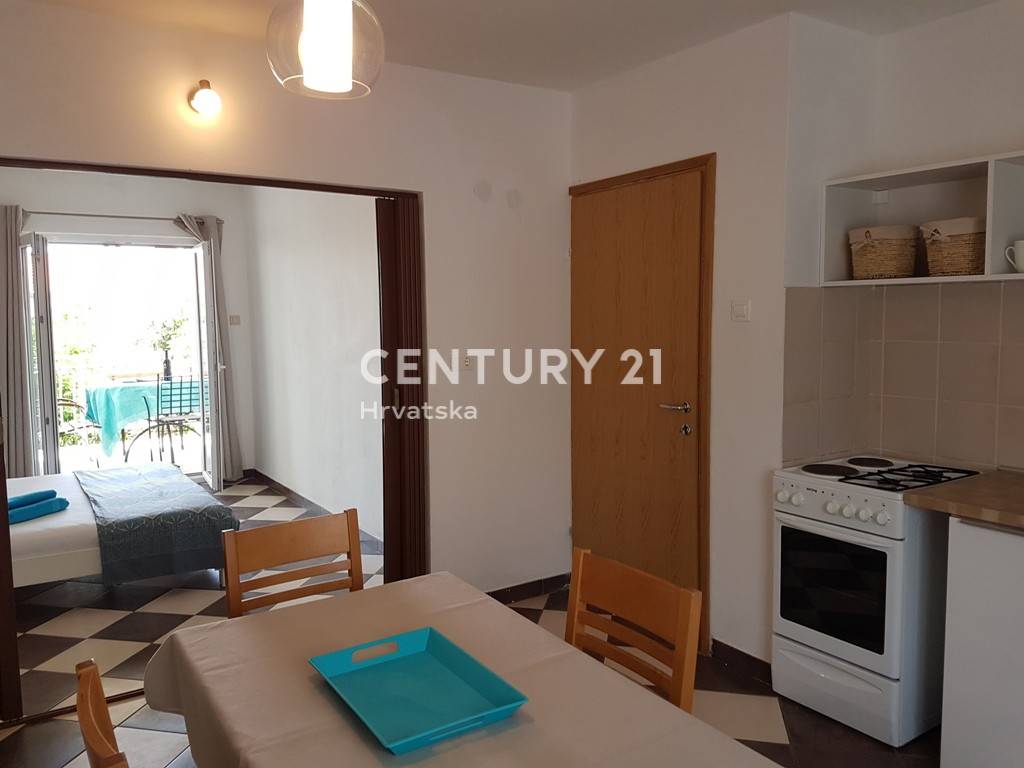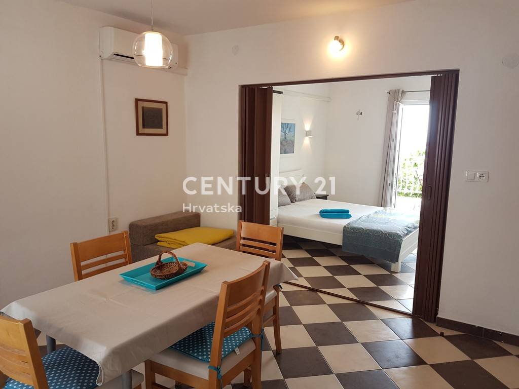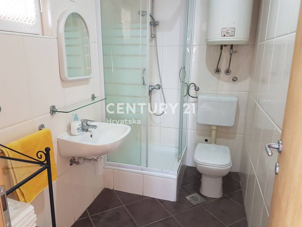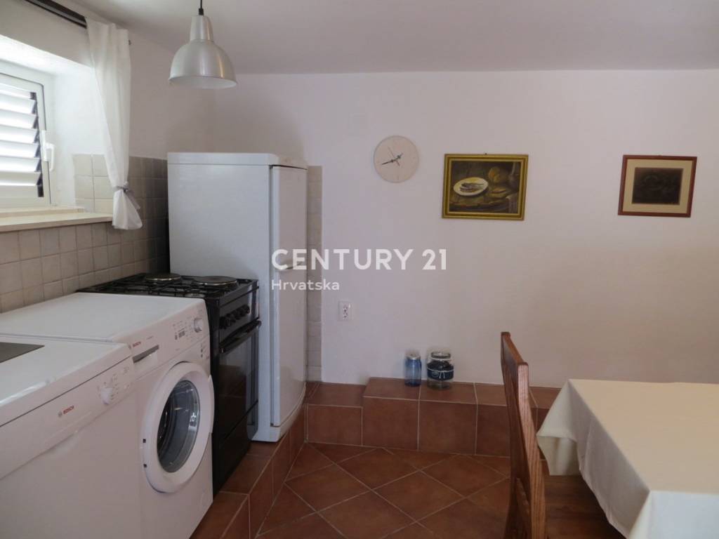 Na prvom katu kuće se nalazi apartman od 57m2 neto površine: kuhinja, dnevni boravak, predsoblje, dvije spavaće sobe, kupaonica i velika terasa.