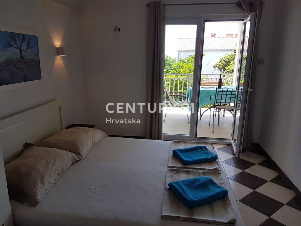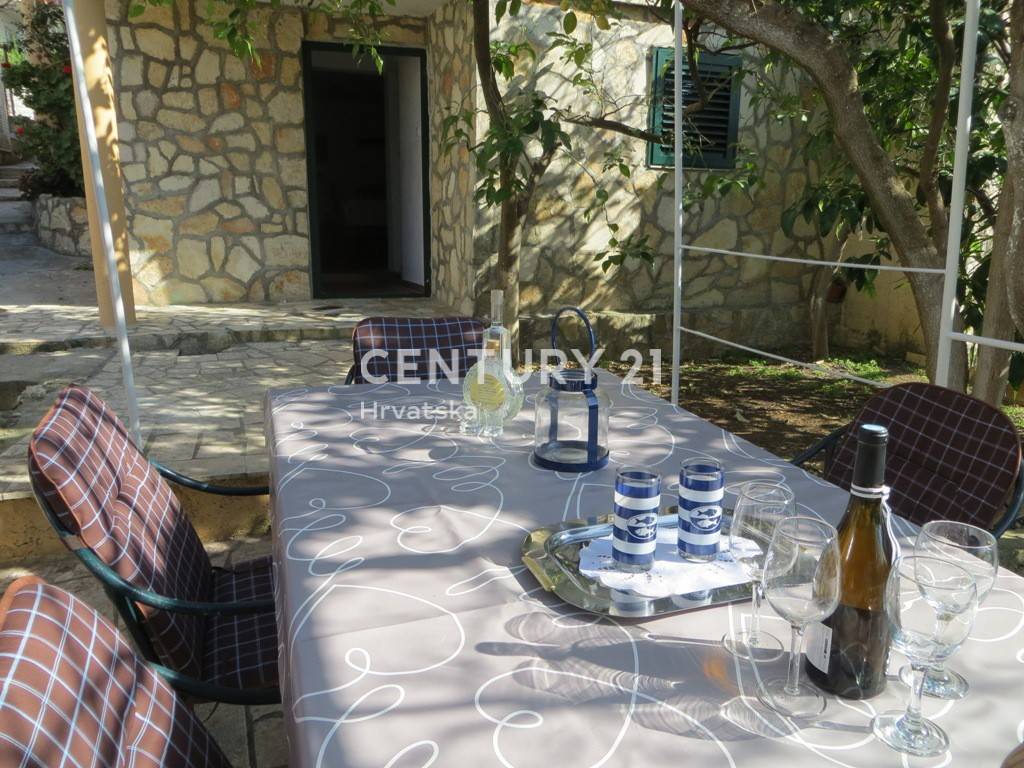 Kuća ima uređenu okućnicu na kojoj su vrt i roštilj, idealnim za opuštanje na otvorenom. Na prvo i drugom katu kuće su velike prostrane terase 20m2 koji omogućuju uživanje u lijepom pogledu na more.