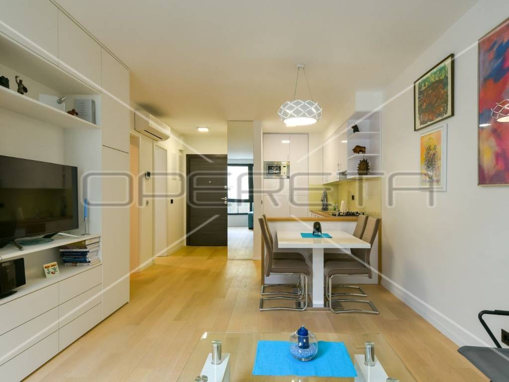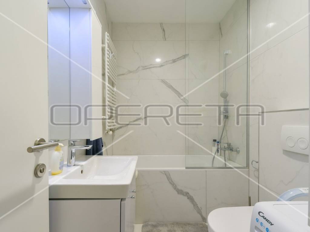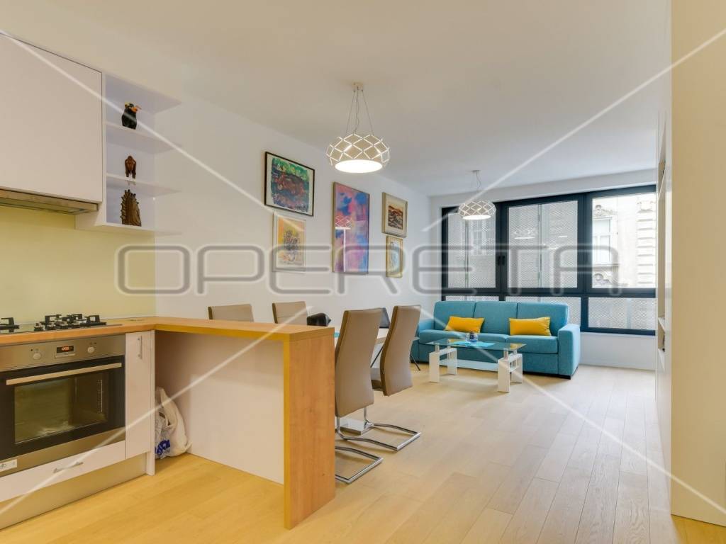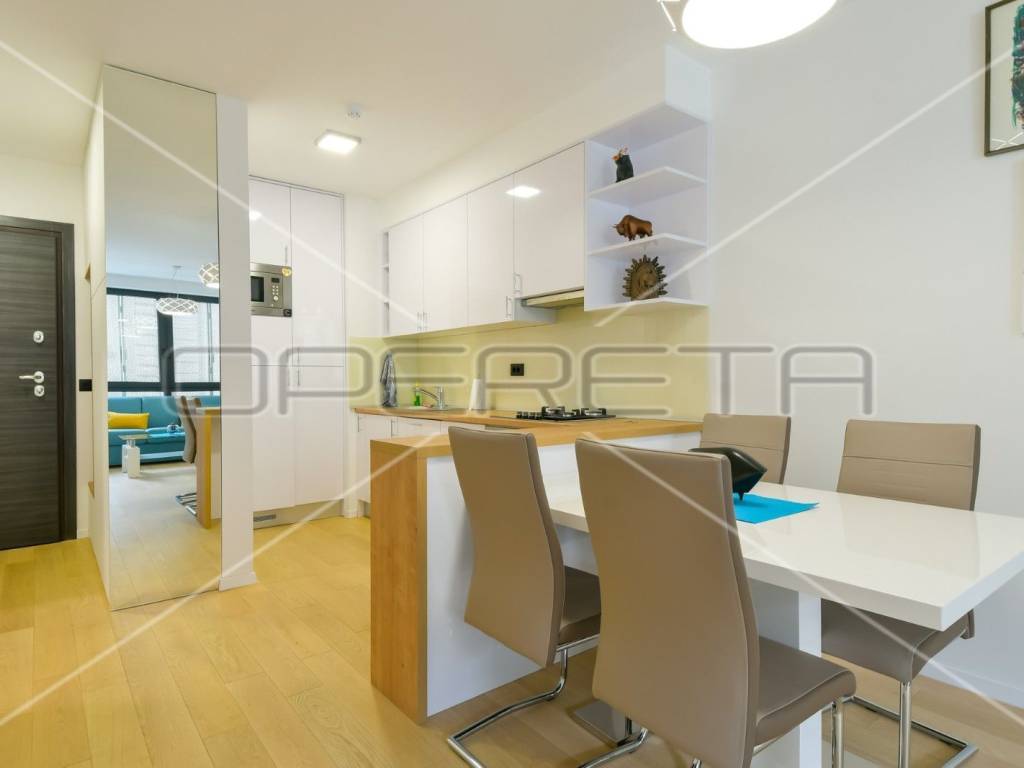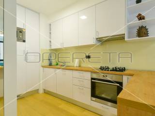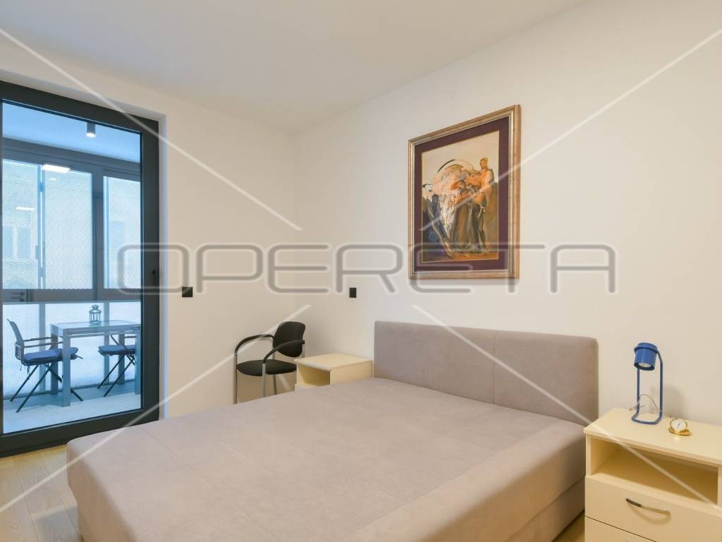 RENT, APARTMENT, Trešnjevka, two-storey. The apartment consists of a living room with a kitchen and a dining room, an entrance hall, a bedroom, a bathroom and a staircase to the ground floor and a storage room in the basement, which includes: garden 1 with an area of 73m2, 2 garage parking spaces. Great location near all facilities for life!