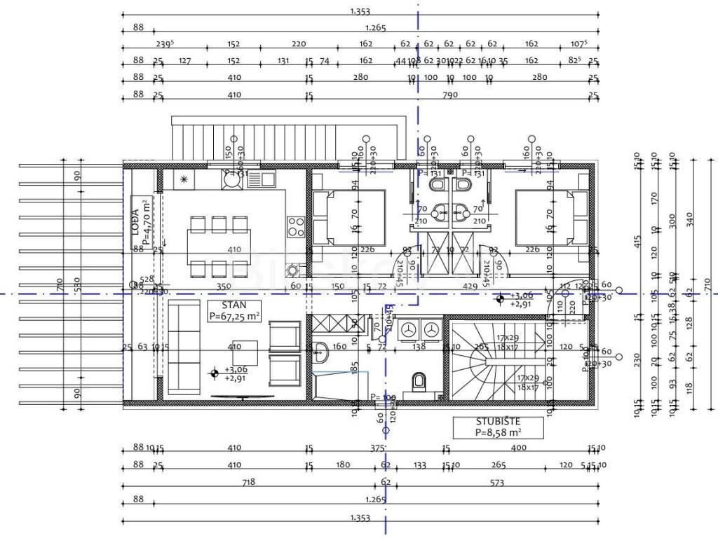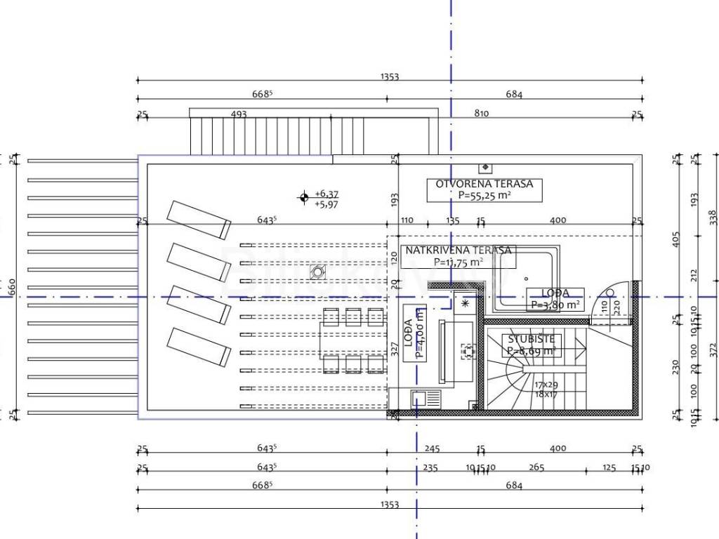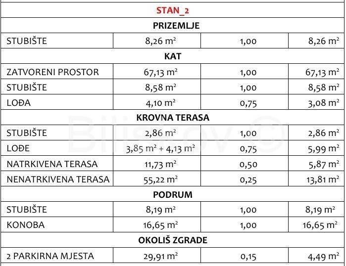 An exceptional two-level three-room apartment with a calculated usable area of 145 m will be located on the first floor and the roof of a modernly designed building. The property consists of a 67 m apartment, a 67 m rooftop terrace, two parking spaces with a total area of 30 m, a 20 m staircase, a 17 m cellar (konoba), and three loggias with a total area of 12 m. A detailed surface-area table can be found among the attached images and floor plans.