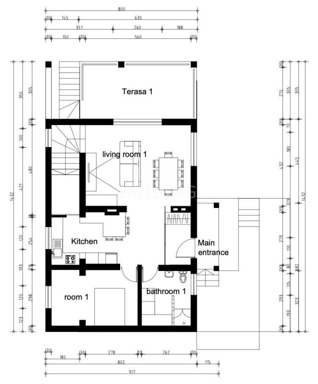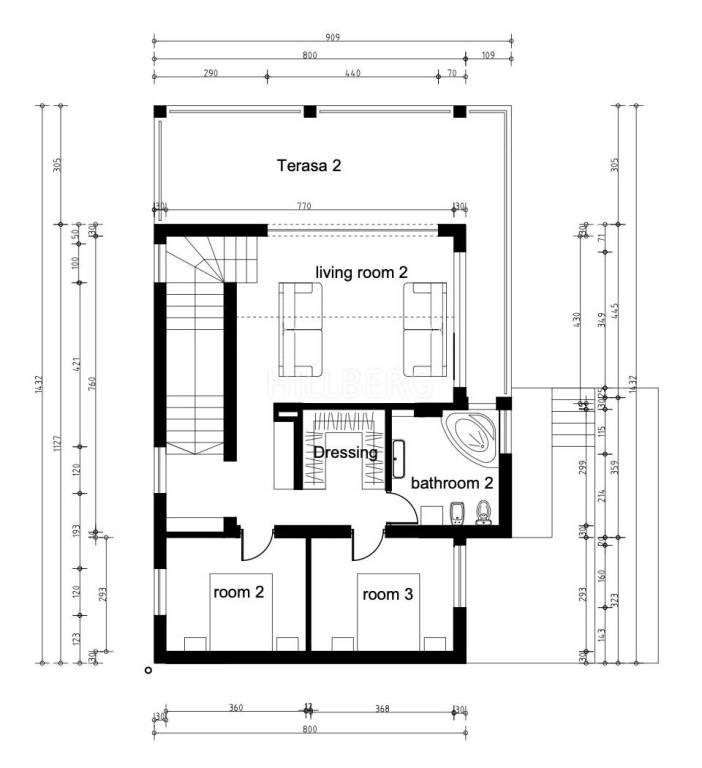 It covers an area of ​​240 m2 + 55 m2 terrace, and consists of 2 living rooms, 2 terraces, 3 bedrooms, 1 study, 2 bathrooms (shower and hydro-massage tub), wardrobe, laundry room. Garage for 2 cars.