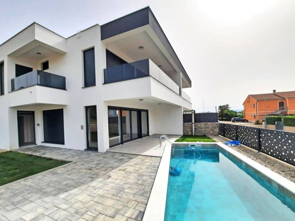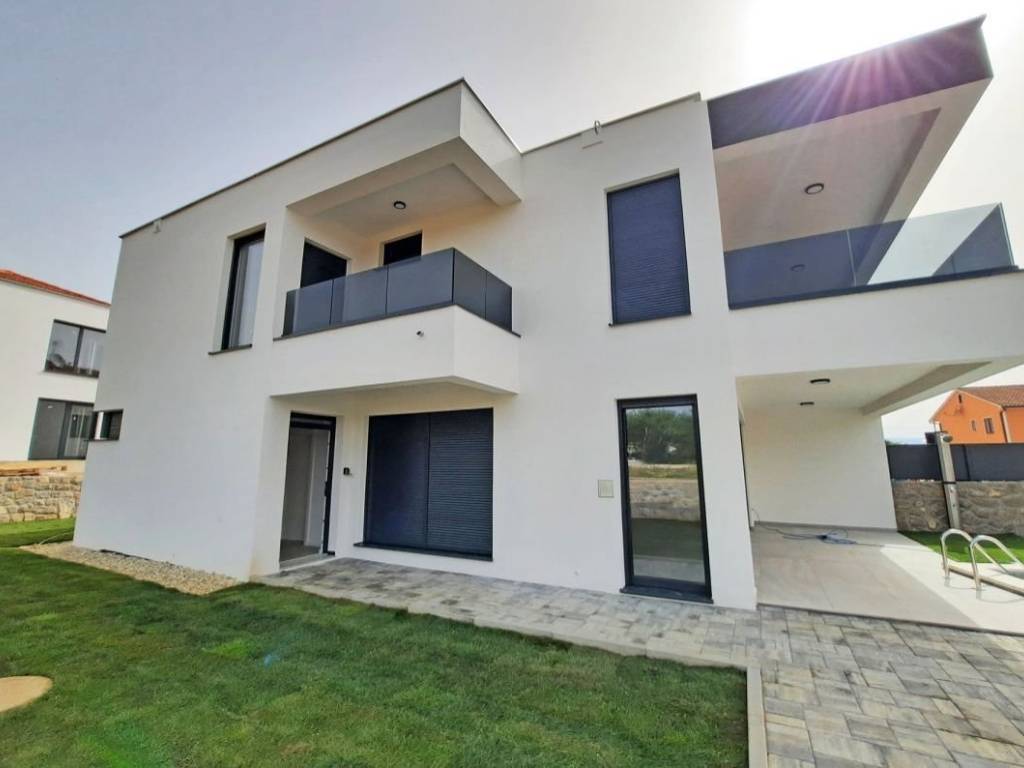 Otok Krk, Malinska, prodaja nove dvojne kuće površine 160 m2, s bazenom i pogledom na more. Kuća se sastoji od prizemlja s dnevnom sobom, kuhinjom, blagovaonom, kupaonicom, hodnikom i terasom, te prvog kata s tri spavaće sobe s vlastitim kupaonicama, garderobom, hodnikom i dva balkona. Kvalitetna gradnja i oprema, PVC stolarija s električnim roletama, klimatizacija, podno grijanje, dva parkirna mjesta. Mirna lokacija, 1000 m od mora.