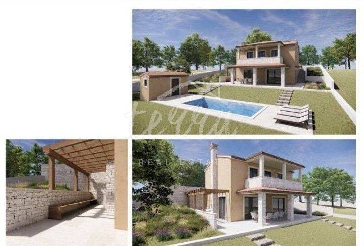 An unfinished house for sale in a small, quiet village near Pazin, surrounded by greenery.