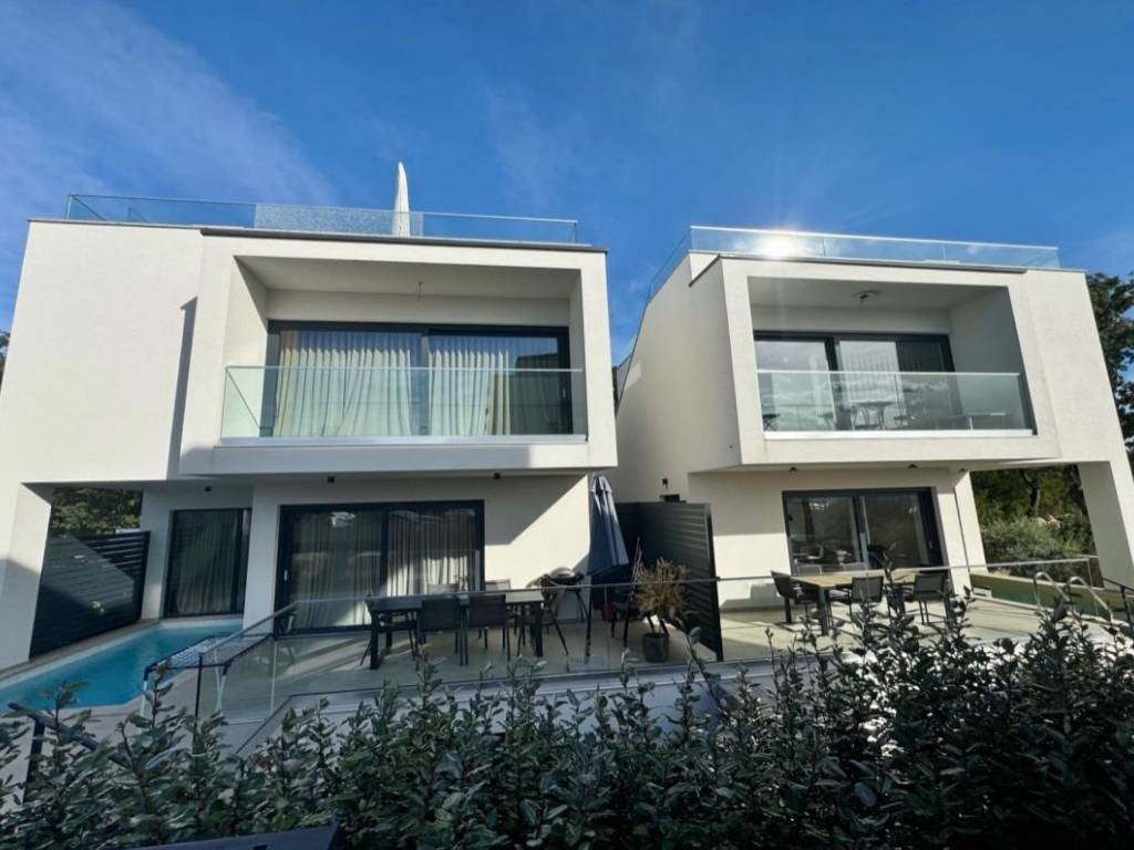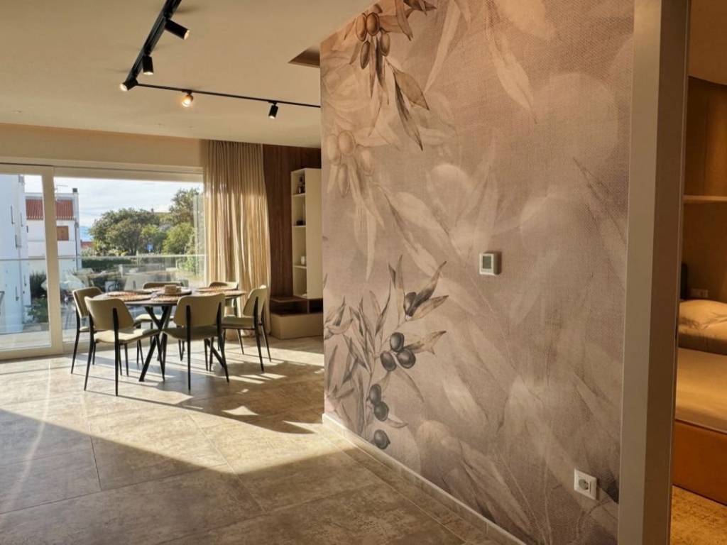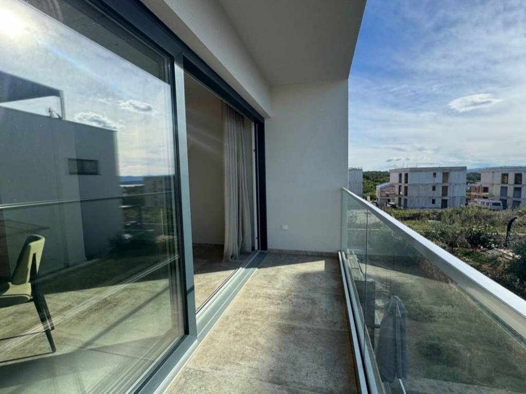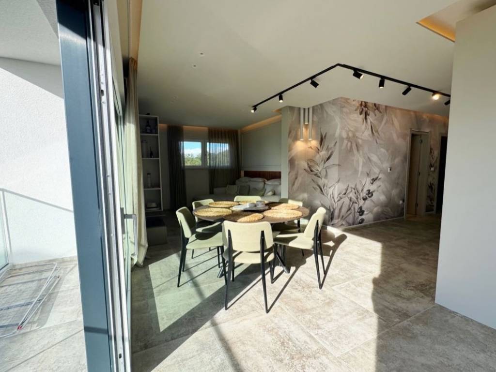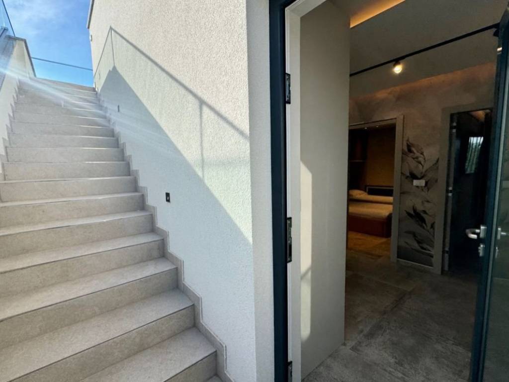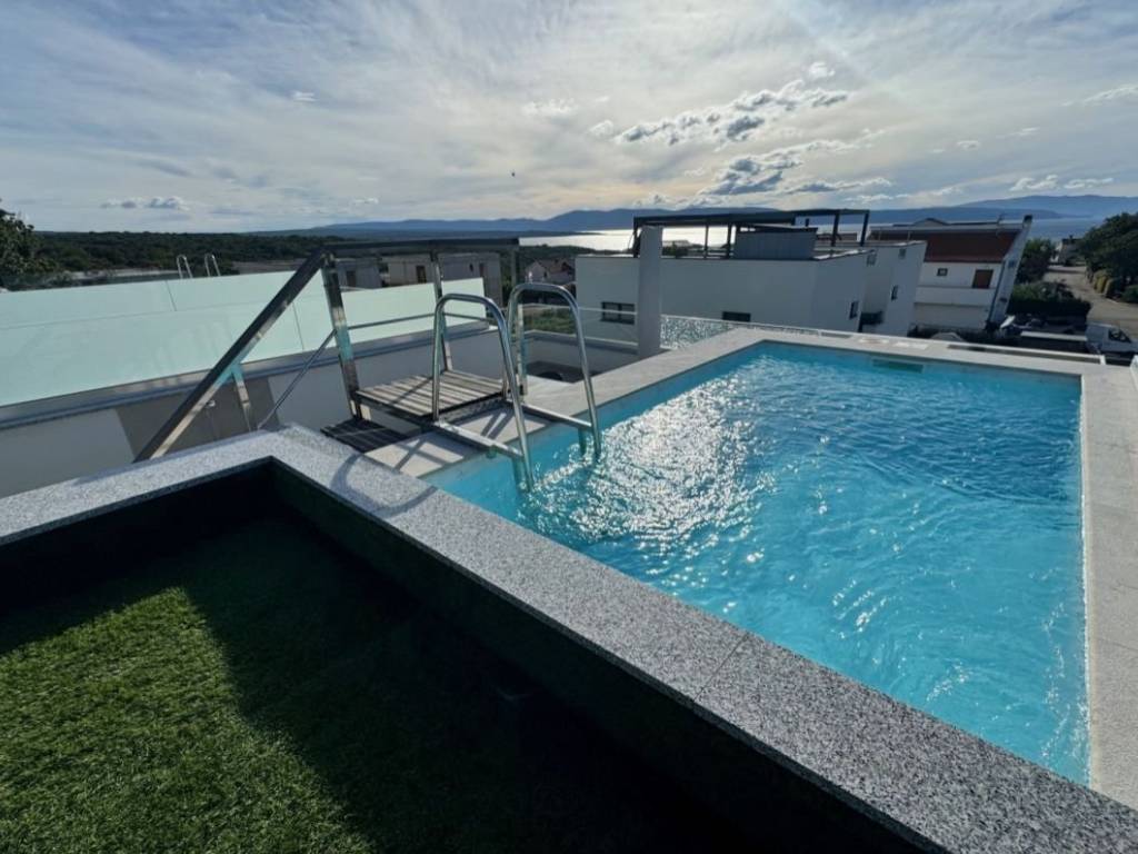 Otok Krk, Njivice, prodaja novog opremljenog apartmana površine 106,22 m2, s pogledom na more i krovnom terasom s bazenom i sunčalištem. Apartman se sastoji od prizemlja s jednom spavaćom osobom, kupaonicom i vešerajem te prvog kata s dnevnom sobom, kuhinjom, blagovaonom, dvije spavaće sobe, kupaonicom i balkonom, povezanih vanjskim stubištem. Vrhunska kvaliteta gradnje i opreme, klimatizacija, podno grijanje, dva parkirna mjesta. Mirna lokacija, 500 m od mora.