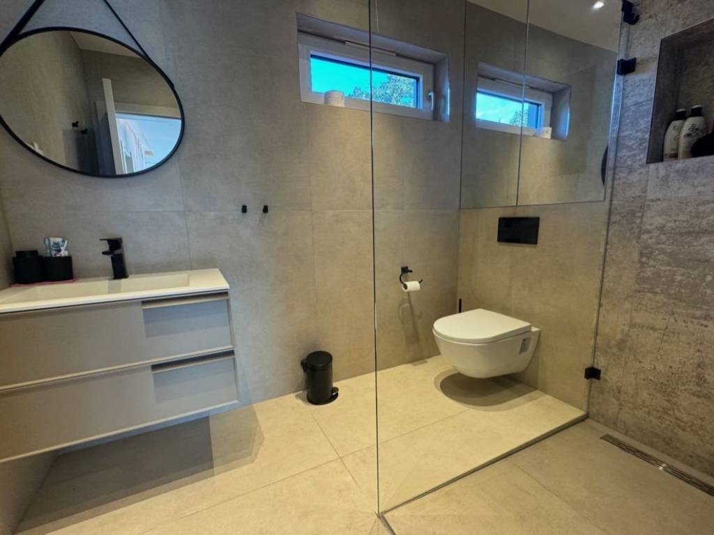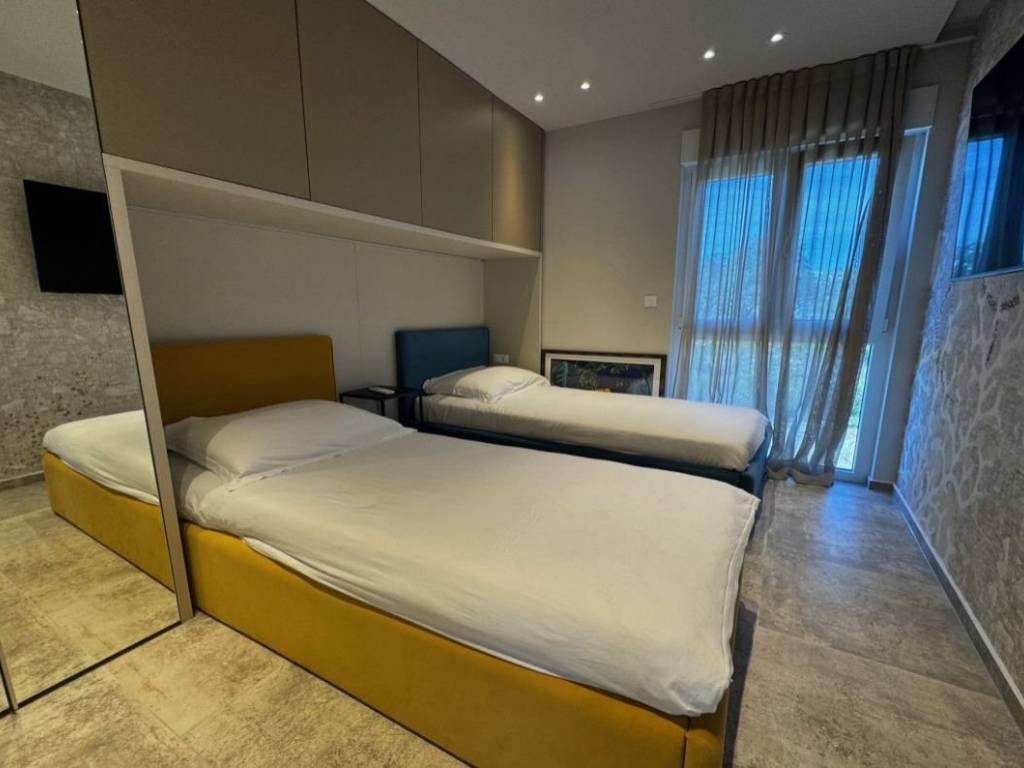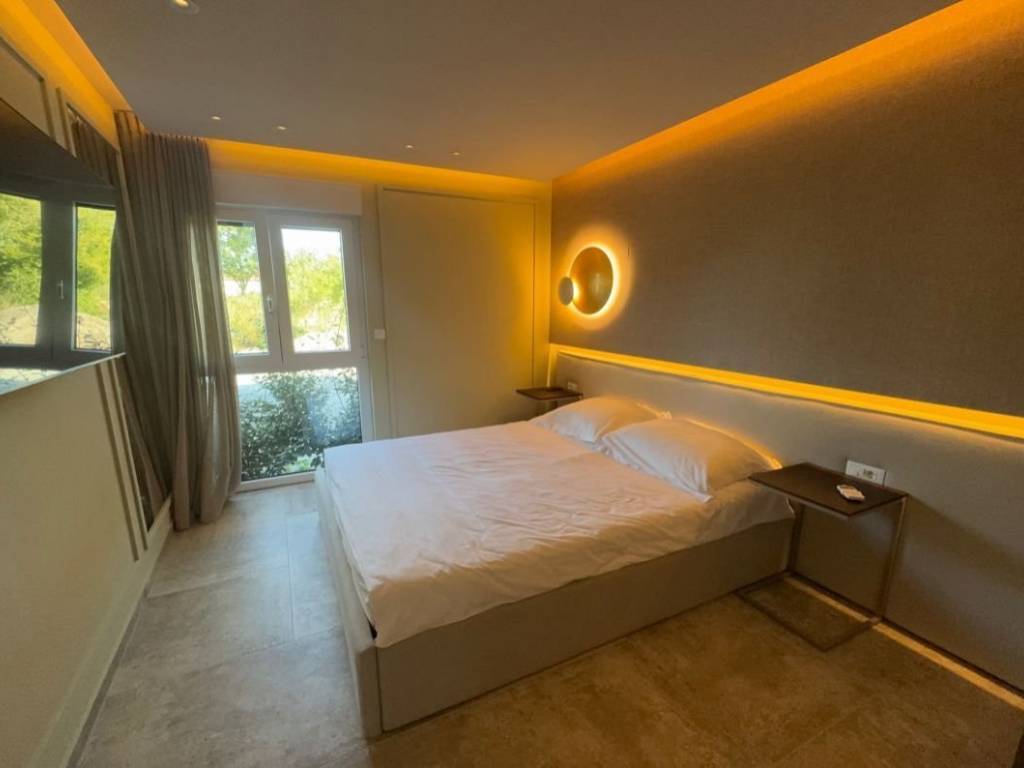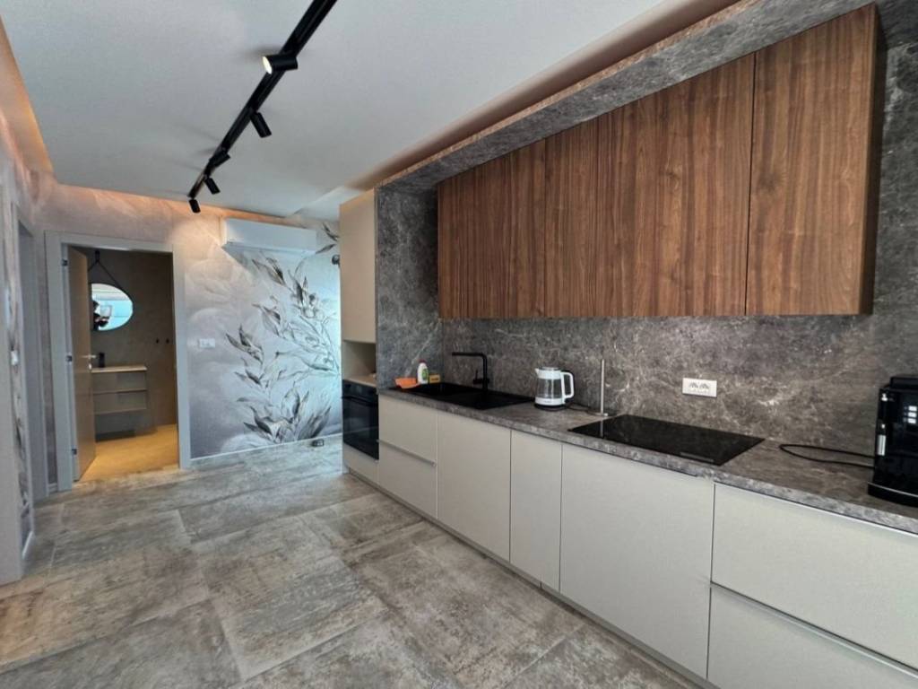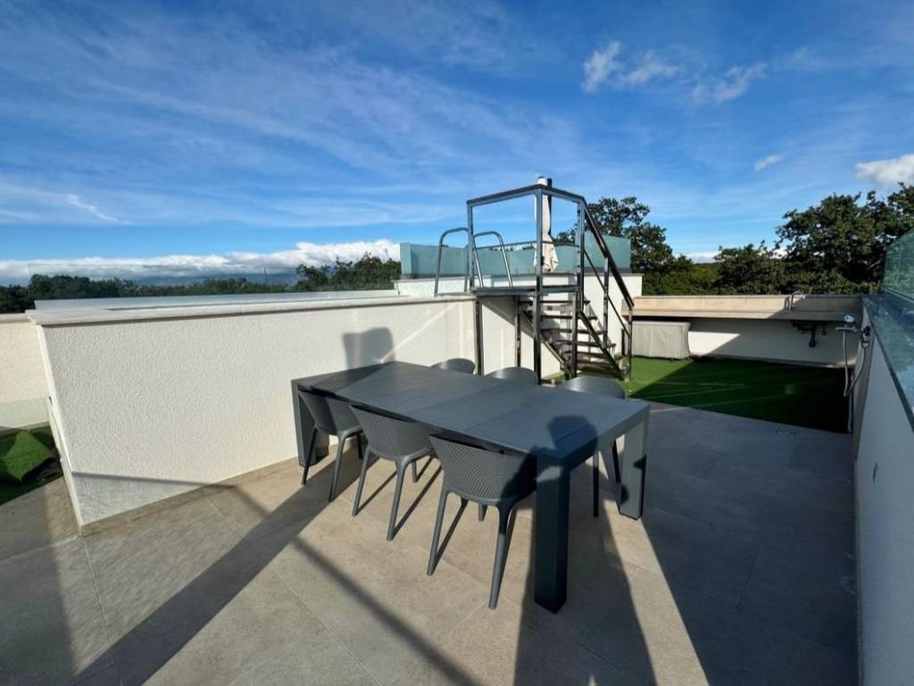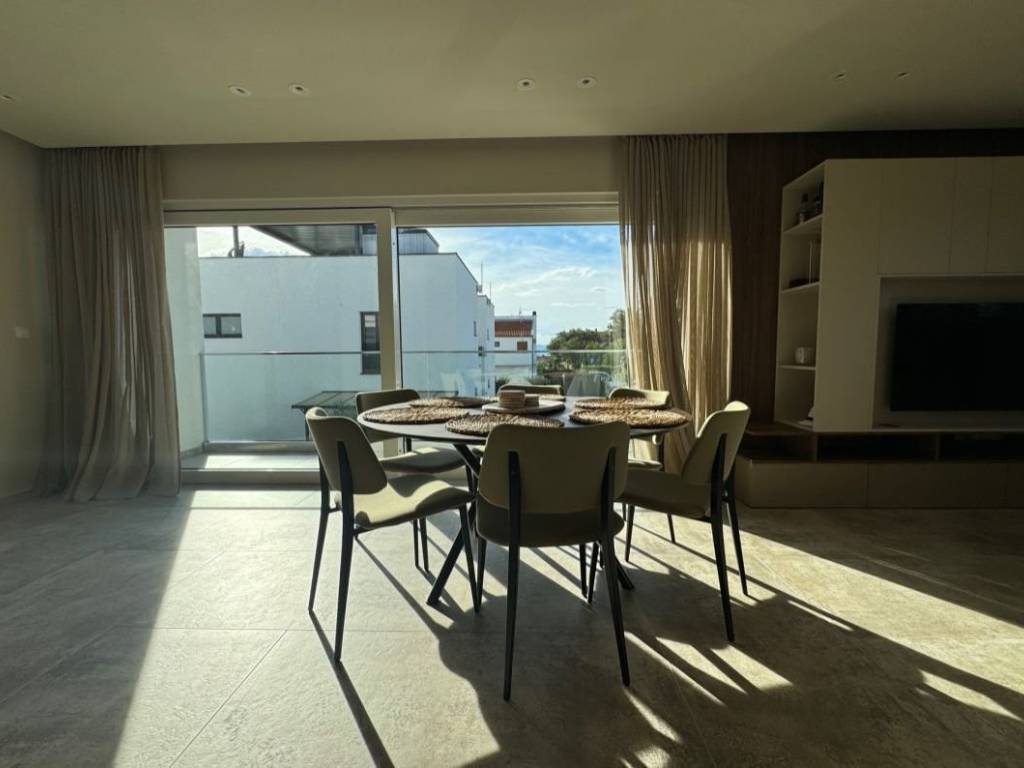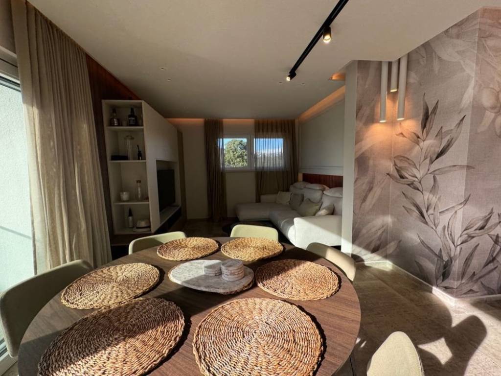 Otok Krk, Njivice, prodaja novog opremljenog apartmana površine 106,22 m2, s pogledom na more i krovnom terasom s bazenom i sunčalištem. Apartman se sastoji od prizemlja s jednom spavaćom osobom, kupaonicom i vešerajem te prvog kata s dnevnom sobom, kuhinjom, blagovaonom, dvije spavaće sobe, kupaonicom i balkonom, povezanih vanjskim stubištem. Vrhunska kvaliteta gradnje i opreme, klimatizacija, podno grijanje, dva parkirna mjesta. Mirna lokacija, 500 m od mora.