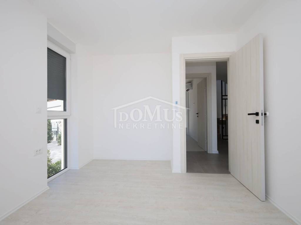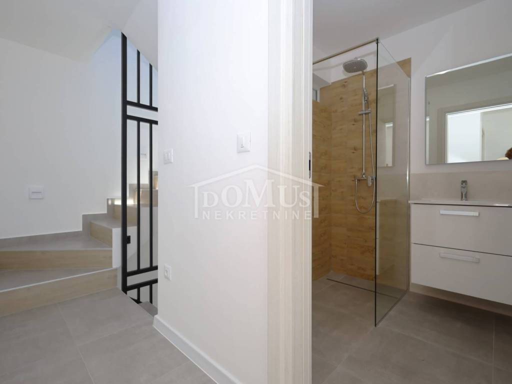 Family house in Tisno, 480 m from the pebble beach. The house is a semi-detached house on three floors: ground floor, 1st floor and 2nd floor / roof terrace with a total of 96.14 m² of usable area and 30 m² of garden with a large terrace of 15 m². The ground floor of the house consists of a hallway, a bathroom, a storage room, a large living room with a kitchen and a dining room with access to a terrace with an adjoining yard. On the first floor of the house there are three bedrooms, a bathroom and a hallway. On the 2nd floor of the house there is a large roof terrace of 24.50 m² with a view of the sea. The house is completely finished and ready for immediate occupancy. It is equipped with burglar-proof doors, ALU carpentry with electrically controlled blinds, underfloor heating in the bathrooms and air conditioning in every room. The surroundings are decorated with Mediterranean plants, and the parking area is paved. The house is 300 m from the sea and 1000 m from the town center.