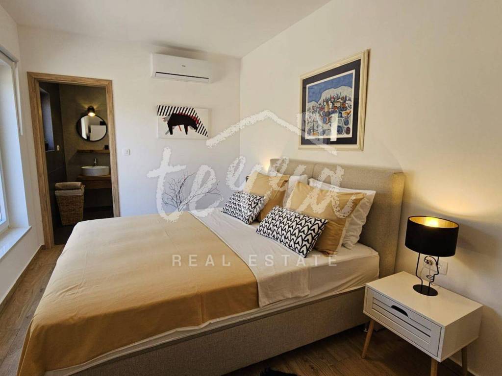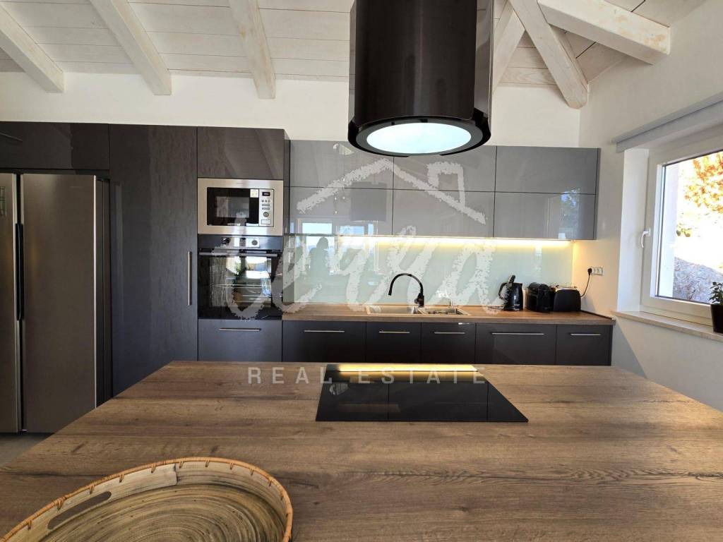 Inside it hides a modernly equipped interior with all the necessary contents for the undisturbed enjoyment of your dream holiday or residence. The villa can accommodate eight people and has four bedrooms with en-suite bathrooms. On the ground floor of the villa there are two bedrooms, a spacious, bright living room with an additional sofa bed for two people and a modern kitchen with dining room. On the upper floor there are two further bedrooms with panoramic sea views. The entire space is air-conditioned, a heat pump (underfloor heating) and a fireplace are installed.