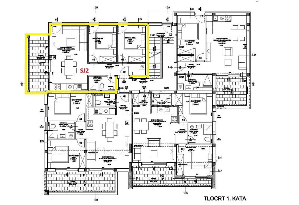Residential "SJ2" is located on the ground floor of the building and has a usable area of 65,04 m². The apartment consists of an entrance hall, bathroom, two bedrooms, kitchen with dining room and living room with access to a covered terrace. The apartment has an outdoor parking space. The building is only 800 m from the beach and 900 m from the town center and all main amenities.