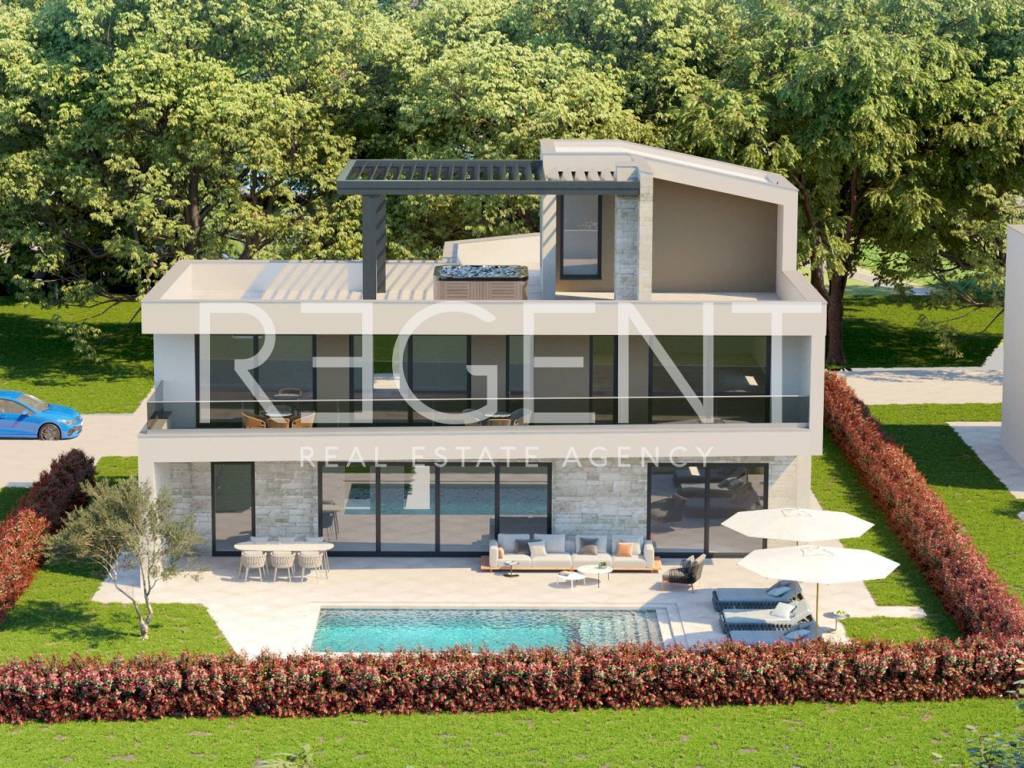 Vi presentiamo un'elegante e moderna villa in costruzione situata nella tranquilla zona di Tar-Vabriga, a soli 7 chilometri dal centro di Parenzo e a meno di 3 chilometri dalla costa. Questa lussuosa proprietà è ideale per chi cerca la perfetta combinazione di privacy, comfort e vicinanza al mare, ma anche per chi prevede l'affitto turistico di alta categoria. La villa si estende su tre piani con una superficie netta di 306,03 m². Al piano terra si trova un ampio soggiorno con cucina e sala da pranzo, una zona benessere, un bagno, un ripostiglio, un corridoio e una lavanderia, e lo spazio è completato da un portico coperto e una terrazza. Al primo piano ci sono quattro camere da letto, ognuna con il proprio bagno, un corridoio, una scala e una terrazza coperta e scoperta. Il secondo piano offre una terrazza sul tetto con vista panoramica sul mare. La villa è dotata di pompa di calore elettrica con riscaldamento a pavimento, aria condizionata in tutte le stanze e camino nel soggiorno, garantendo il massimo comfort e lusso. Il giardino è recintato e nella parte centrale si trova una piscina all'aperto di 32 m² circondata da solarium e terrazza coperta. La posizione della villa offre un perfetto equilibrio tra privacy e praticità. Nelle immediate vicinanze ci sono negozi, ristoranti e altri servizi, mentre la costa dista meno di 3 chilometri. Parenzo è facilmente raggiungibile e le strade principali consentono un facile accesso a tutte le parti dell'Istria. Le superfici sono accuratamente distribuite, con una combinazione di parquet e piastrelle di ceramica, e la terrazza lussuosa, il giardino recintato e la piscina sottolineano ulteriormente l'esclusività della proprietà. Per maggiori informazioni e per organizzare una visita, non esitate a contattarci.