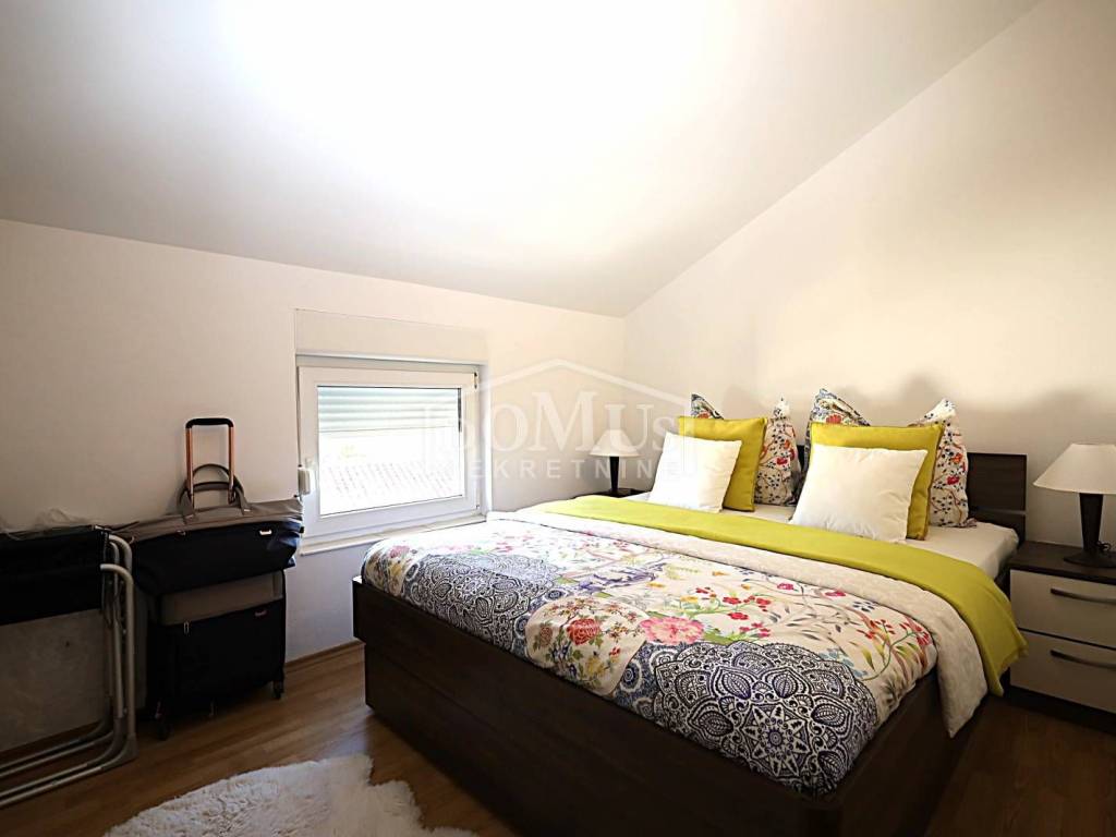 Srima, attractive location just 110 m from the beach. One-bedroom apartment with a total usable area of 40.20 m². The apartment is located in the attic of a residential building with a total of three floors and consists of a hallway, one bedroom, a living room with kitchen that opens onto a semi-covered balcony, offering a partial sea view.