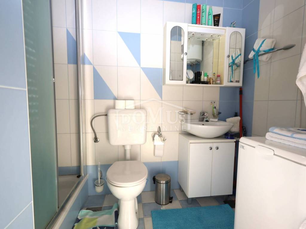 The apartment is modernly furnished, well laid out, and fully equipped; the furniture is included in the property price. It features PVC joinery, windows with mosquito nets, and an air conditioning unit in the living room. One parking space belongs to the apartment. Distance to the sea and the maintained beach: 110 m; distance to the town centre: 700 m.