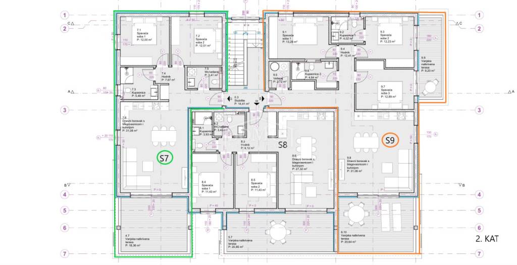 Vodice new building, residential building with a total of 9 residential units. Apartment "S9" is located on the 2nd floor, has a living area of ​​108.39 m² and consists of an entrance hall, bathroom, three bedrooms, one of which has its own bathroom and access to a terrace, kitchen with dining room and living room with access to a large covered terrace of 20.64 m2 with a panoramic view of the sea. The apartment has a modern design and functional layout, equipped with air conditioning in the living room and bedrooms, electric underfloor heating in the bathroom and living room, security entrance doors, PVC joinery, electric roller shutters, and modern bathroom equipment. The apartment has two outdoor parking spaces. The apartment is located 1200 m from the sea as well as the city center and all important amenities. The expected move-in date is summer 2026. The buyer is exempt from paying real estate tax.