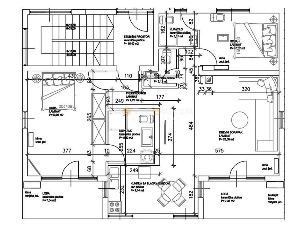 In offerta un attico al 2º piano di un piccolo edificio residenziale a Pola, in una zona più tranquilla, nella zona di Monvidal/Šijana. Questa nuova costruzione è composta dal piano terra, primo e secondo piano, e ogni appartamento si estende su un piano. L'appartamento in offerta si trova al 2º piano (ultimo piano) ed ha una superficie totale di circa 105m2, composto da un ingresso (4,2m2), un soggiorno (28,56m2), una cucina con sala da pranzo (9,14m2), una camera da letto (10,52m2) con bagno privato (3,11m2), una camera da letto (19,08m2) con bagno privato (5,8m2), un WC (2,12m2), e 2 balconi (7,33m2 e 7,04m2).