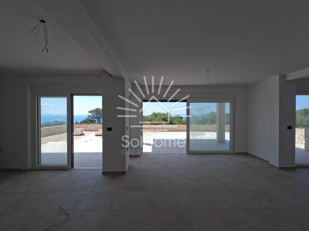 Nella parte anteriore del piano terra si trovano l'ingresso, il soggiorno, la cucina, la sala da pranzo, un bagno per gli ospiti, due ripostigli e l'uscita su una terrazza coperta, la piscina riscaldata e il giardino - il tutto con una splendida vista panoramica sul mare. Nella parte posteriore del piano terra si trova una sauna e uno spazio benessere con bagno privato.