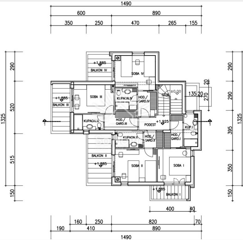 Al piano superiore ci sono quattro camere da letto, ognuna con il proprio bagno, cabina armadio e vista sul mare - tre di esse hanno anche una terrazza privata. I muri esterni sono costruiti con blocchi termici e ulteriormente isolati con polistirolo per massima efficienza energetica. Tutte le stanze sono climatizzate e l'intera casa è dotata di riscaldamento a pavimento.