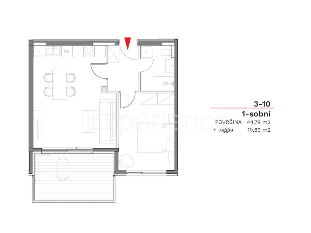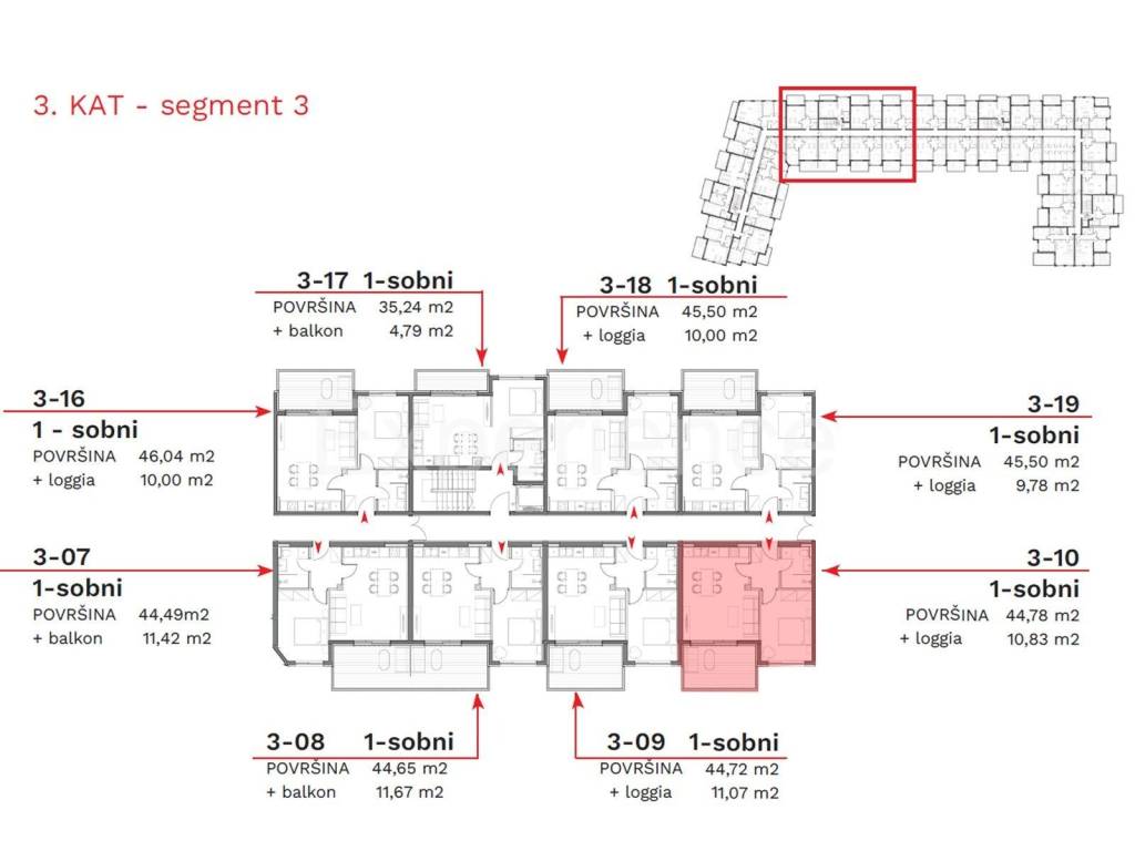 In vendita è un appartamento situato al terzo piano dell'edificio residenziale, con la superficie di 52,90 m. Comprende: corridoio, un spazio aperto e luminoso dove sono situati il soggiorno, sala da pranzo e cucina con accesso al balcone (10,83 m), camera da letto e bagno. L'appartamento dispone inoltre un deposito (3,38 m) e posto auto in garage.