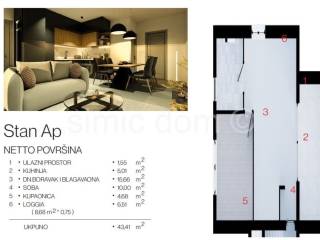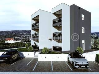A one-bedroom apartment, for sale located in a smaller building currently under construction in Rogoznica. The building is located 270m from the beach and is located on an elevated area. Apartment Ap is placed on the ground floor of the building and has a total net area of 43.41 m2, and an outdoor parking space is included in the price. The apartment consists of an entrance hall, spacious bathroom, bedroom and kitchen together with a living room and dining room with access to a loggia. The building is located in a quiet street on an elevated position, only 270m to the nearest beach and a 10-minute walk to cafes, shops and restaurants. The apartments are sold on a turnkey basis, with built-in air conditioning and equipped bathrooms. The expected completion of construction is autumn 2026.