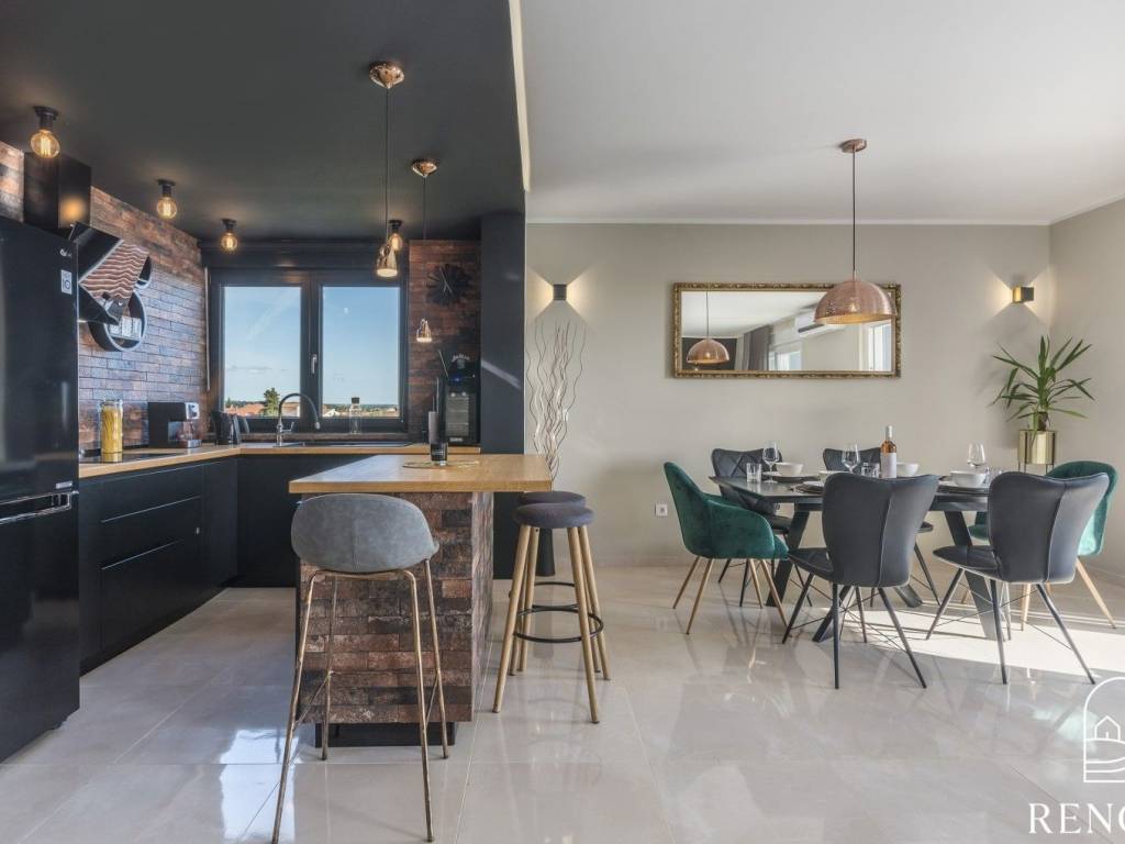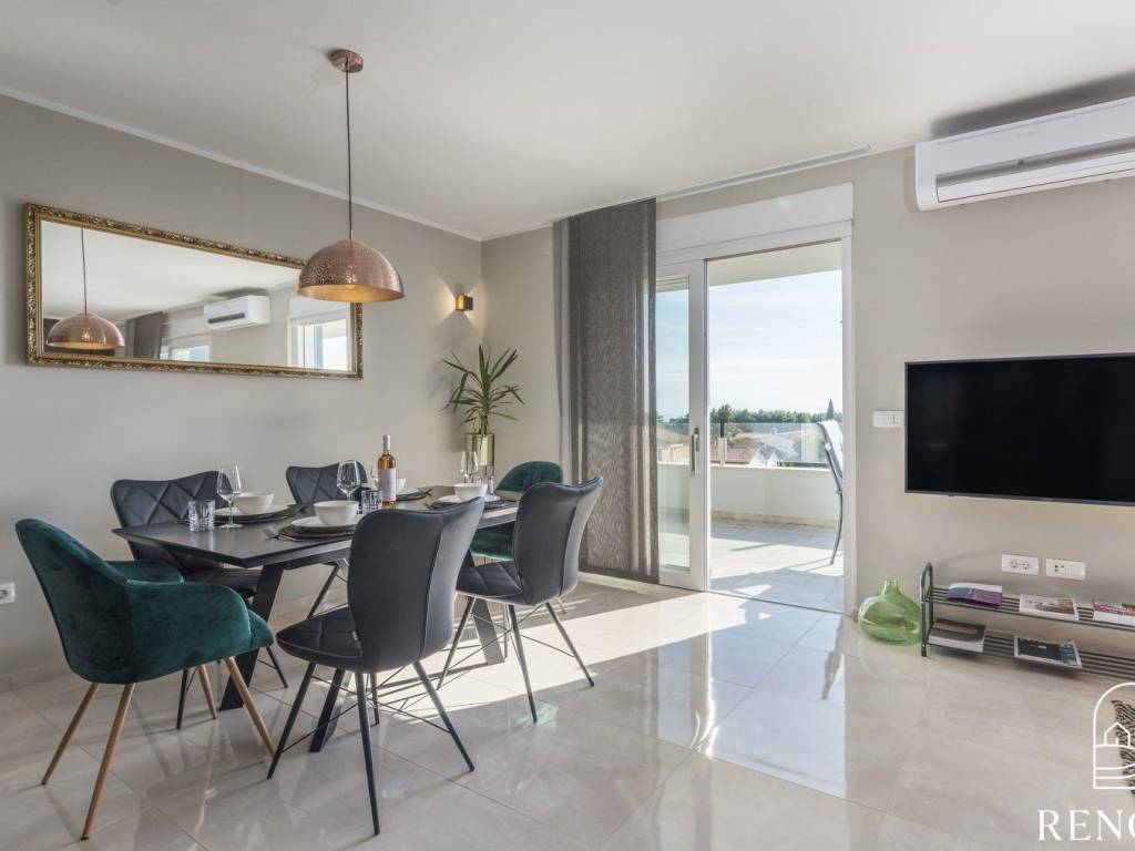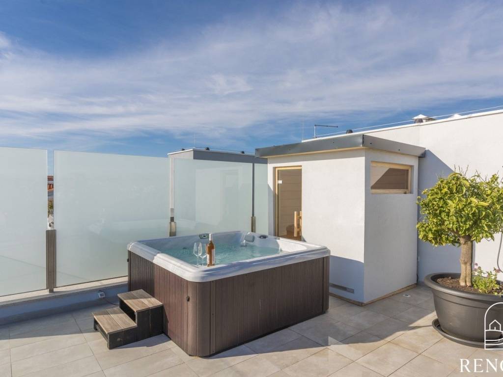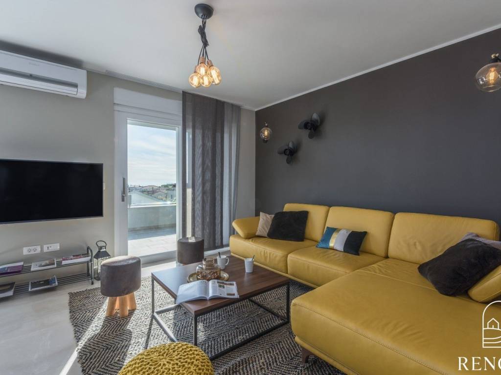 Esclusivo appartamento vista mare in vendita. L'appartamento si trova in un'ottima posizione a soli 400 metri dalla spiaggia più bella di Cittanova. L'appartamento si trova al secondo piano di una palazzina residenziale ed è composto da ingresso, cucina, sala da pranzo e soggiorno, tre camere, tre bagni e sauna. L'appartamento ha due terrazze coperte e due terrazze scoperte, oltre a un'uscita privata sulla terrazza sul tetto di 51m2. L'appartamento è dotato di un posto auto. Ogni camera dispone di un impianto di aria condizionata per il riscaldamento e raffrescamento.