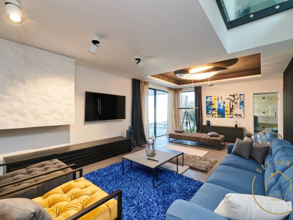 La piscina è straripante ed è piastrellata con ceramica. Accanto alla piscina si trova una sala macchine sotterranea richiesta dalla legge per la clorazione e filtrazione automatica dell'acqua. La piscina è dotata lungo il bordo di una cascata incassata di 250 cm che si attiva dal soggiorno.