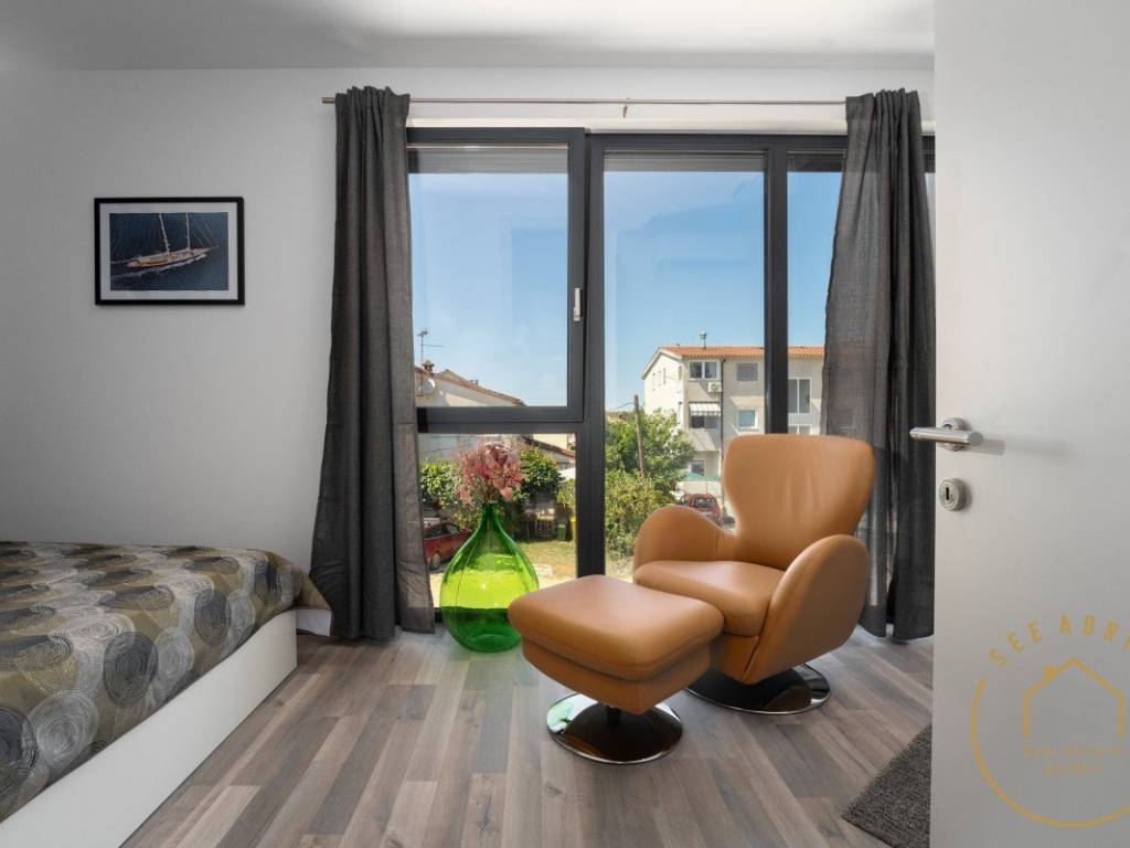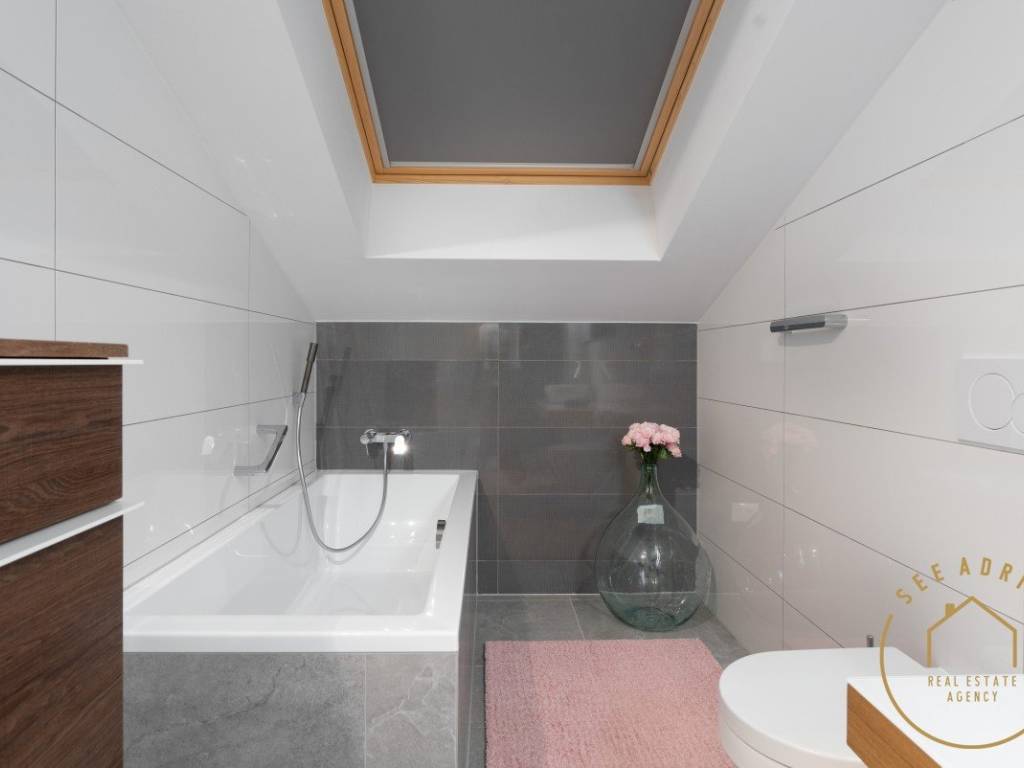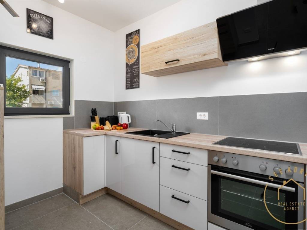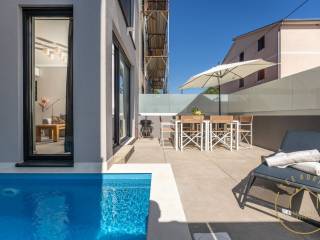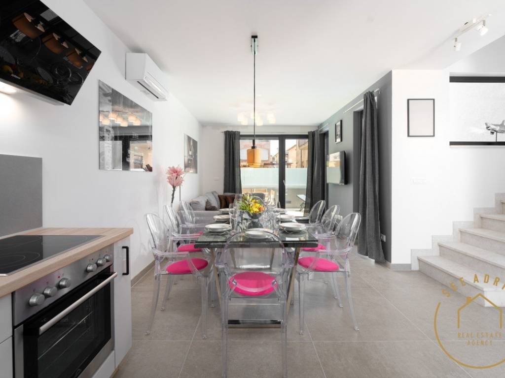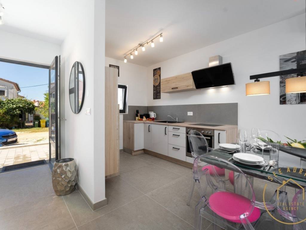 In vendita una casa a schiera con piscina privata. Si trova nel centro di Funtana, a solo un chilometro dalla spiaggia. Al piano terra si trovano la cucina, la sala da pranzo e il soggiorno con accesso a una terrazza privata con piscina. Al piano terra si trovano anche un ripostiglio e un bagno di servizio. Il primo piano è composto da due camere da letto con letti matrimoniali e un bagno. Anche il secondo piano ospita due camere da letto e un bagno. I piani sono collegati da una scala interna.