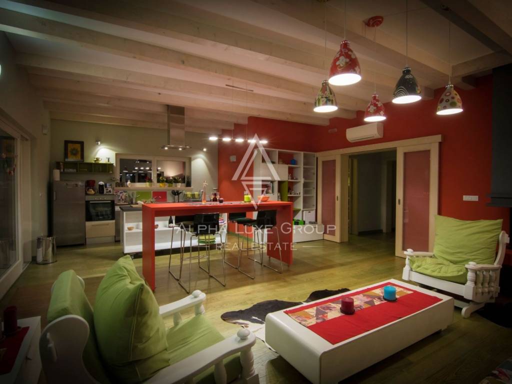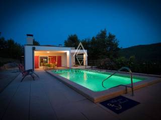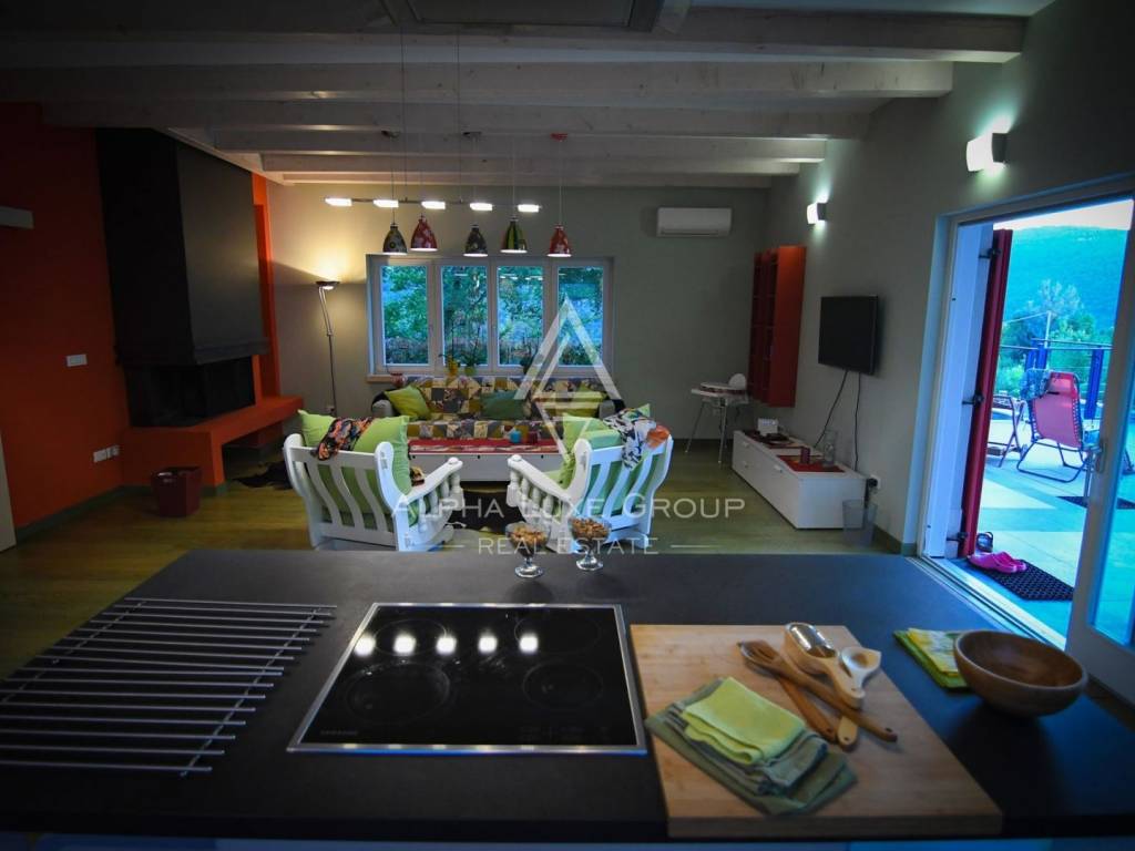 Il soggiorno e la cucina sono uniti in un'unica area, con una terrazza esposta a ovest. Nel soggiorno c'è un camino. Nel patio si trovano una grande griglia e una cucina estiva con un frigorifero aggiuntivo. La piscina misura 8,5 x 3 metri.