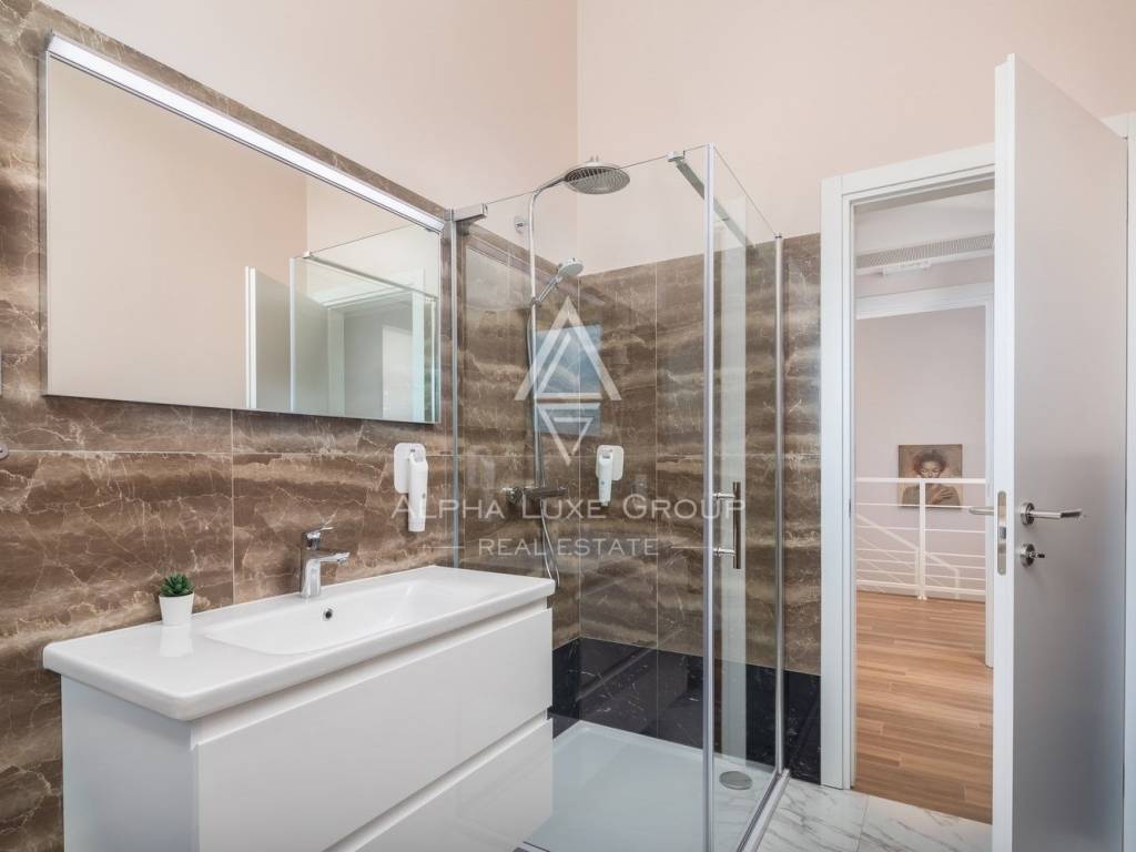 Al piano superiore si trovano altre tre camere da letto, ciascuna con bagno privato e cabina armadio. Tutte le stanze dispongono di accesso diretto a una terrazza scoperta con una splendida vista sui vigneti e sui boschi circostanti, creando un ambiente ideale per il caffè del mattino o il relax serale. Le terrazze private e il giardino paesaggistico valorizzano ulteriormente la tranquillità e la bellezza naturale dell'intera proprietà.