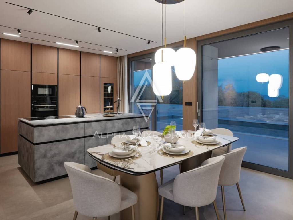 Immersa nella tranquilla costa di Krnica, questa villa di lusso di nuova costruzione offre una combinazione eccezionale di architettura moderna, materiali di alta qualità e una vista mare mozzafiato. Situata su un terreno di 890 m², la villa si estende per 298 m² distribuiti su due eleganti livelli progettati per offrire comfort, funzionalità e uno stile di vita mediterraneo raffinato.