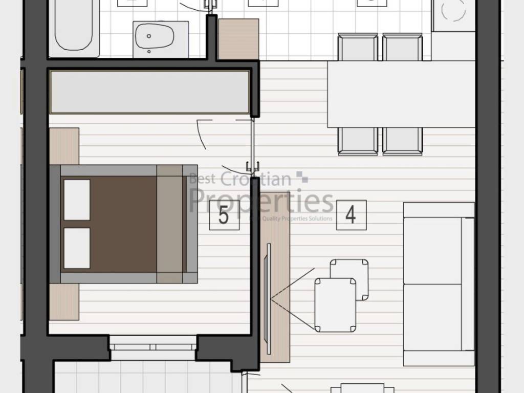 Sami stan ima 42.29m2 i sastoji se od ulaznog prostora (2.85m2), dnevnog boravka sa blagavaonicom (16.89m2), kuhinje (4.60m2) sobe (9.90m2), kupaonice (4.28m2) i loggie od 5.02m2 (5.02m2 x 0.75= 3.77m2).