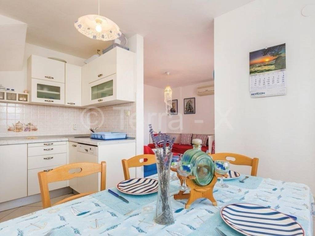 U etaži kata nalaze se ulazni hodnik, dnevni boravak, kuhinja s blagovaonom, soba, kupaonica, ostava i loggia.U etaži potkrovlja se nalaze još dvije velike sobe i kupaonica.Sve sobe su klimatizirane.Na korištenje je i dio vrta s voćkama: smokve, nektarina, trešnja, maroni...Vrt je popločen bijelim kamenom. Novopostavljeni roštilj u dvorištu.Stol i stolice za boravak u vanjskom prostoru.Zgrada ima novu fasadu, 2025. je napravljen novi krov i postavljeni su novi oluci.Zgrada ima priključak na brzi optički internet.Apartmanu pripada i vlastiti natkriveni parking.Apartman je kompletno namješten i opremljen vrhunskim aparatima. Kuhinja rađena po mjeri. Talijanski keramički sudoper, napa, svi aparati uključujući i perilicu posuđa, nova indukcijska ploča na štednjaku 2+2, hladnjak sa zamrzivačem, mikrovalna pećnica, profesionalni aparat za kavu, komplet posuđa i kuhinjskog pribora, perilica rublja, itd...Apartman ima dvije kupaonice i dva wc-a.Moguć boravak do dvije obitelji sa do 8 članova istovremeno.Uredno vlasništvo.Odmah useljiv.