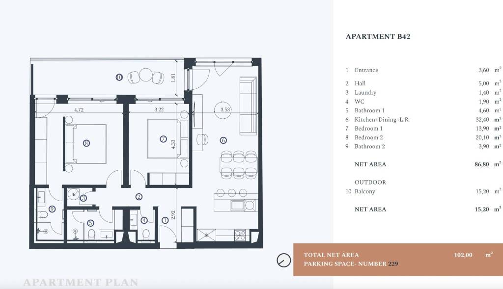 Apartment B-42 – 2nd floor – living area 86.80 m² (2 bedrooms + 2 bathrooms + WC) + balcony (15.20 m² – park view) + outdoor parking space No. 229, total net surface 101.20 m² = EUR 846,580.00 (furnished)