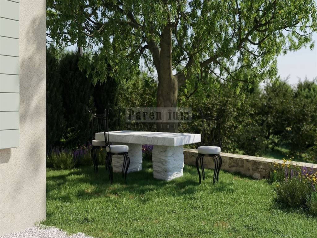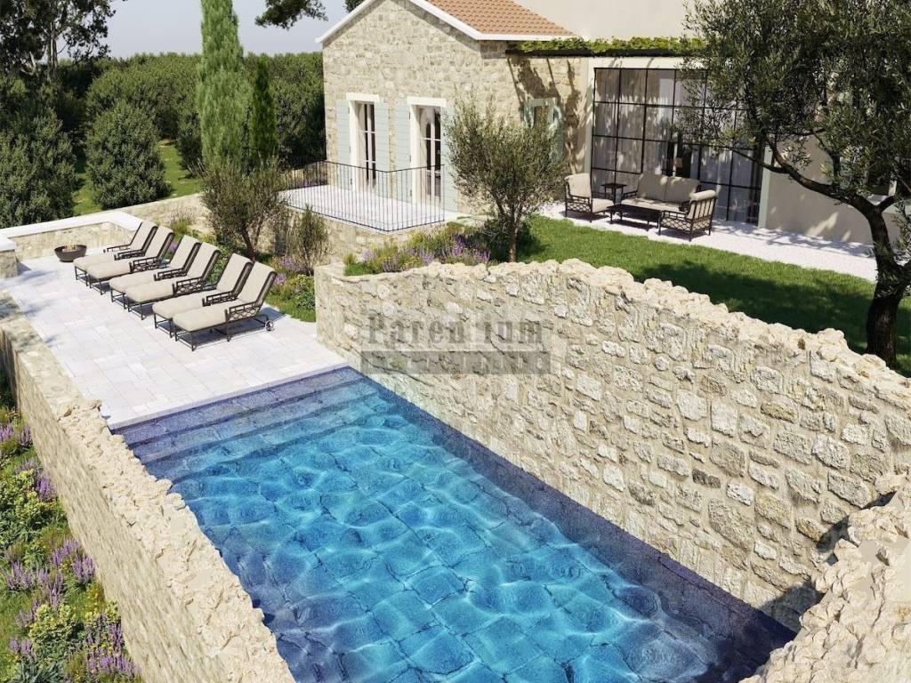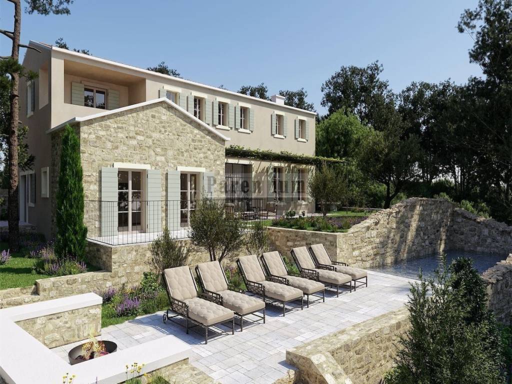 Istria, Verteneglio in vendita è una bellissima villa in pietra di 270m2. Il piano terra della villa dispone di un ampio soggiorno, cucina, sala da pranzo, una camera da letto con proprio bagno e toilette per gli ospiti. Al piano terra si trova un'area benessere interna con accesso al soggiorno esterno. Al primo piano ci sono altre 3 camere da letto, ognuna con il proprio bagno. Il giardino ha una superficie di 1000 mq, con una cucina estiva, solarium e una piscina unica, come se fosse immerso nell'ambiente. Si affaccia sul mare, sui vigneti e uliveti circostanti, quindi la casa offre una perfetta pace e privacy. Il completamento previsto della costruzione è nel 2022.