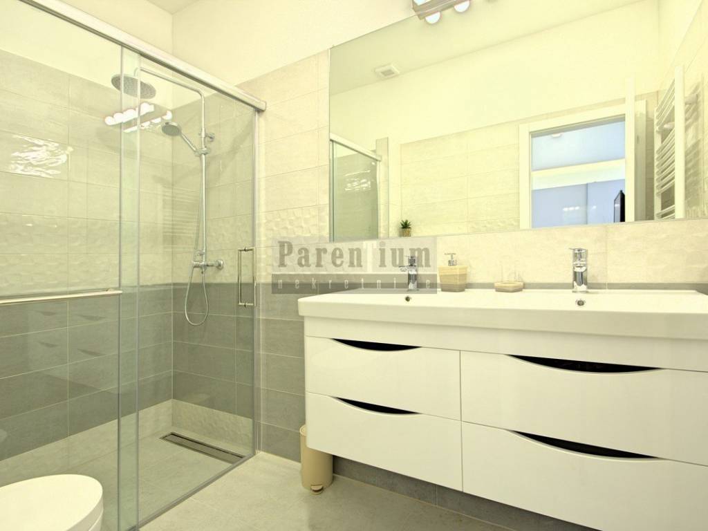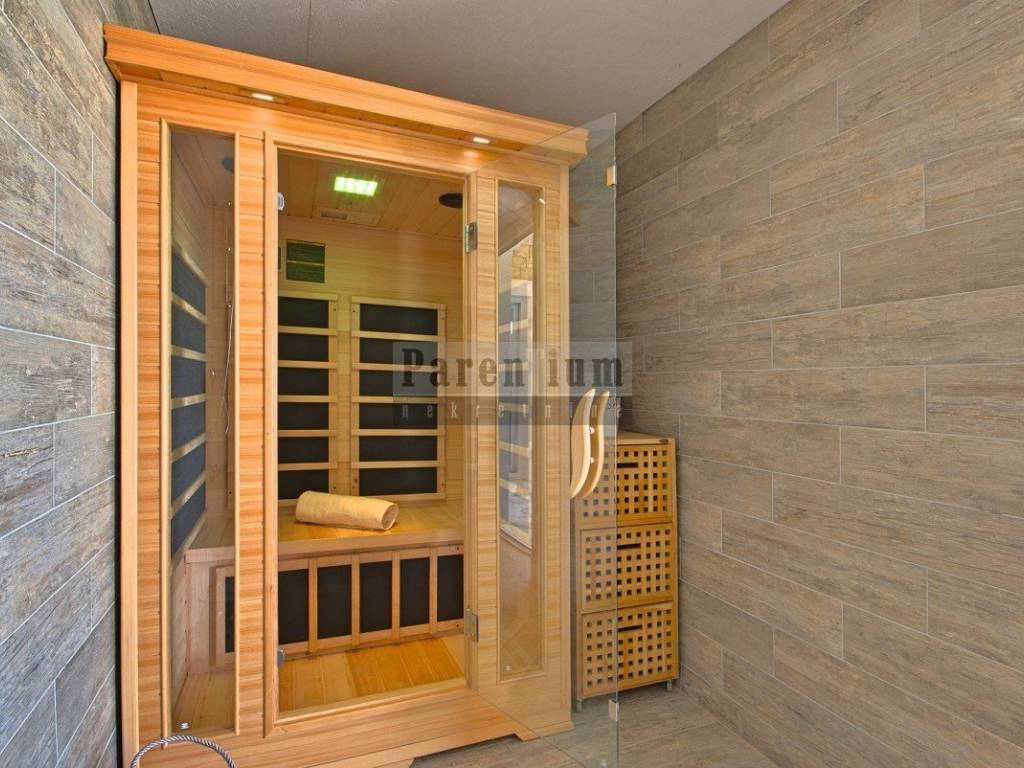 Il cortile è di 380 m2, con piscina, area prendisole, cucina estiva, sauna e jacuzzi.